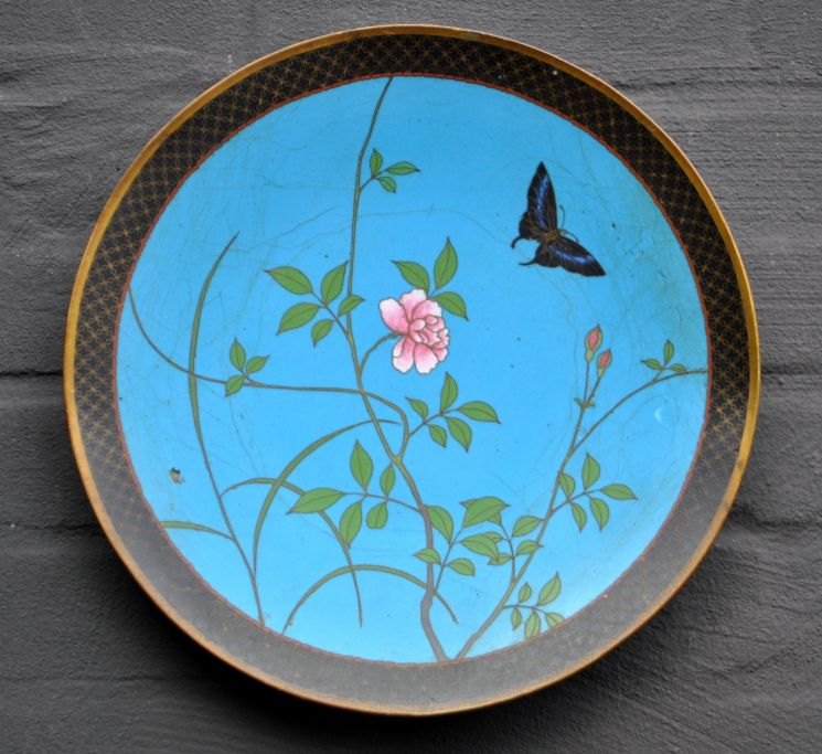 Japansk cloissonne fad, 19. årh. Dekoreret med gren med blomst og sommerfugl. Dia.: 30,5 cm.
