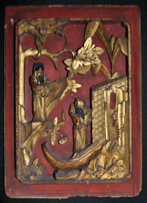Kinesisk træskæring, 19. årh. Delvist forgyldt. Snittet med sceneri af mænd og båd. 37 x 26 cm.