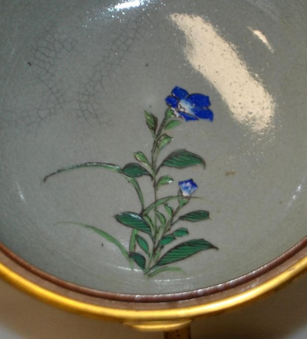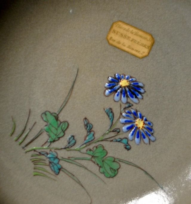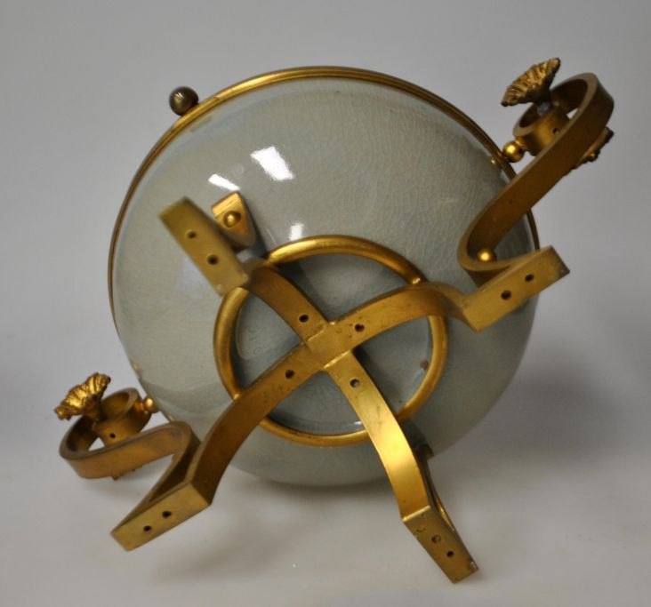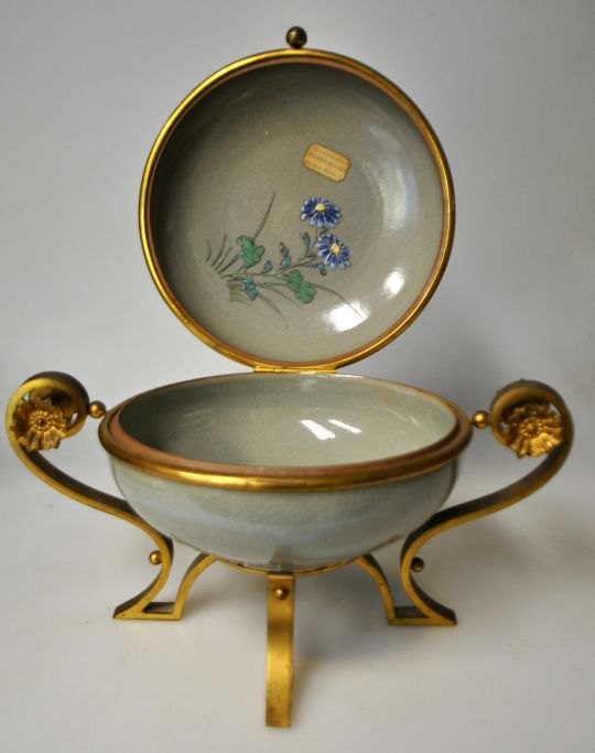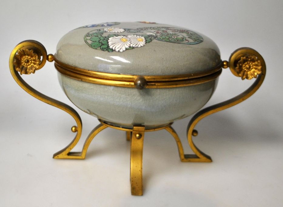 Susse Frères lågkrukke med bronze, ca. 1900. Paris. Frankrig. Lågkrukke i fajance med håndmalede dekorationer i form af blomster. Monteret på lueforgyldt stel med hanke. H.: 12 cm. Dia.: 22 cm. med hanke. Dia skål: 14,5 cm.