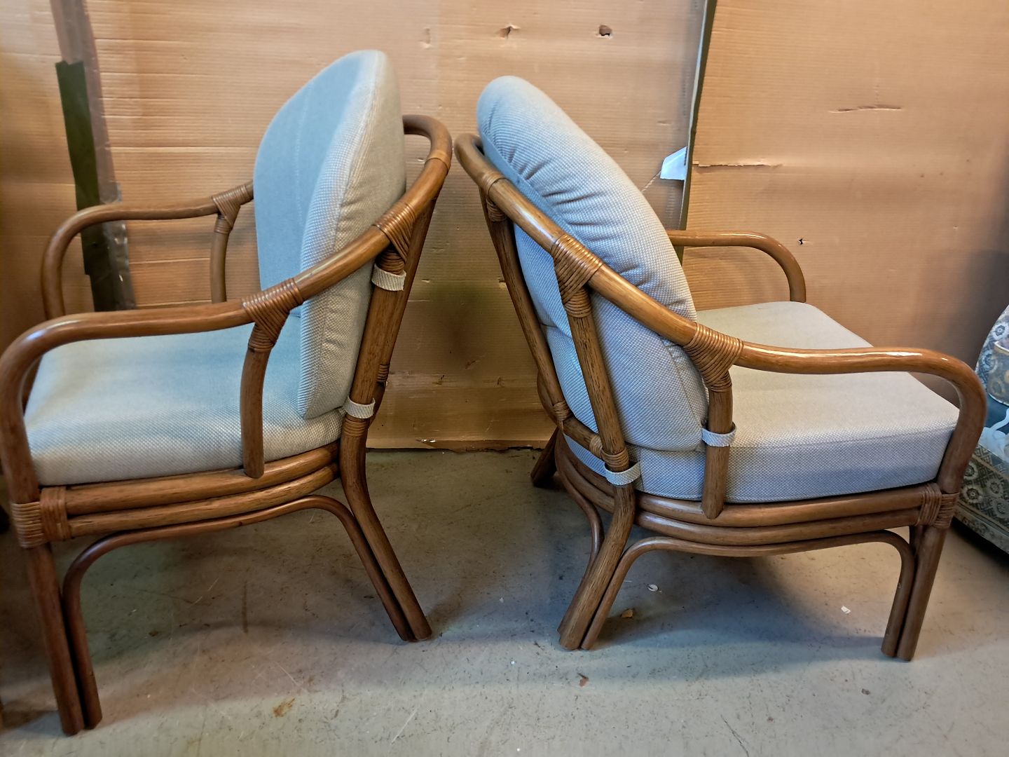 3 Stole, en fodskammel og lille bord i bambus, af nyere dato.