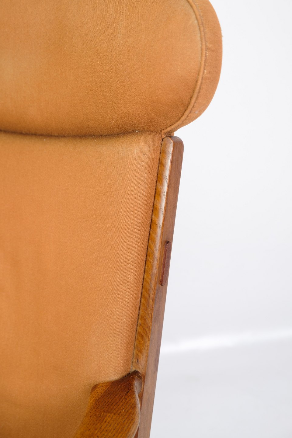 Lænestolen model AP 15, designet af Hans J. Wegner og produceret af AP Stolen i 1951, er udført i egetræ og polstret med orange stof. Stolen er kendt for sin høje ryg og buede armlæn, der giver både komfort og et elegant udtryk.