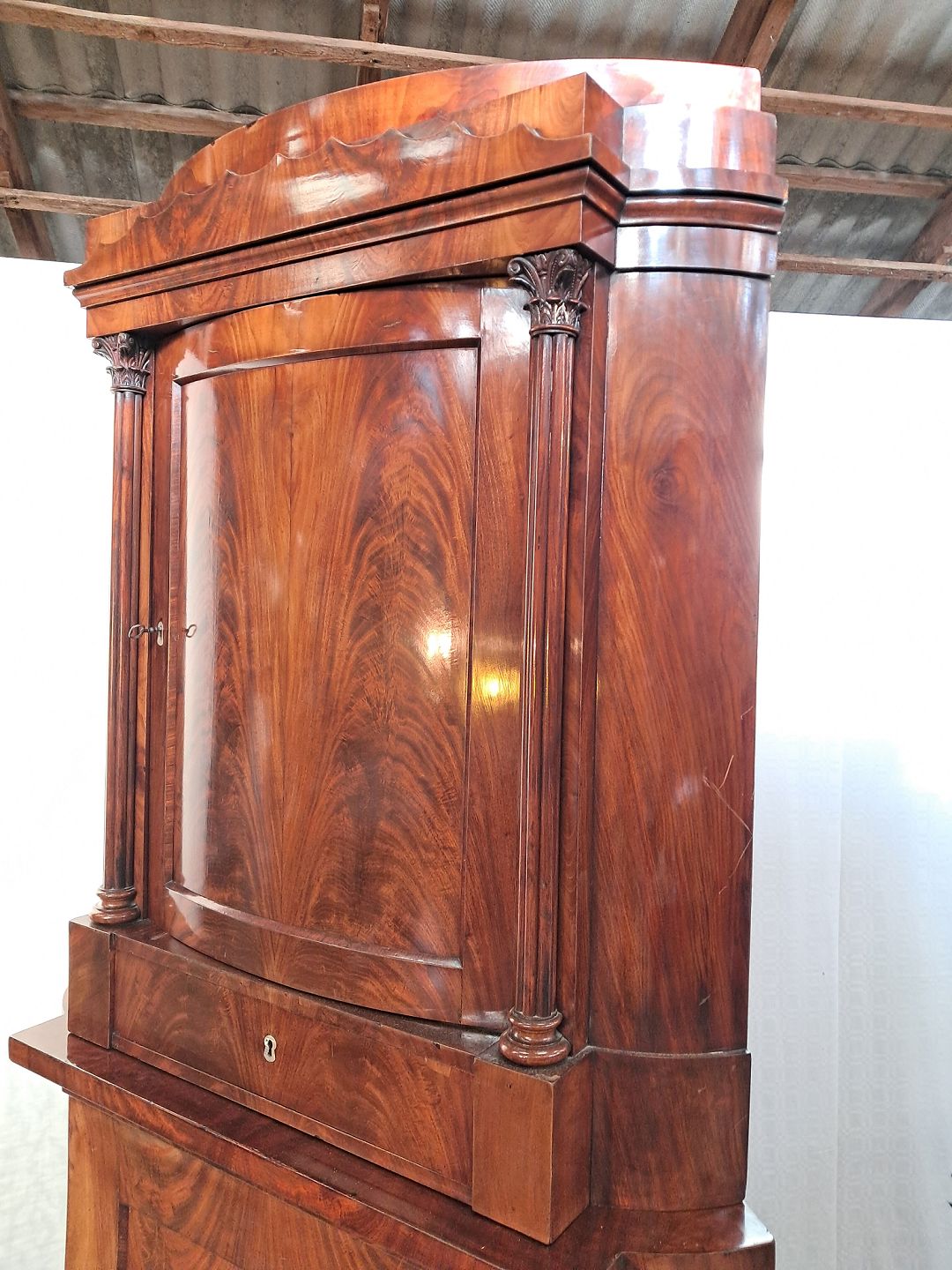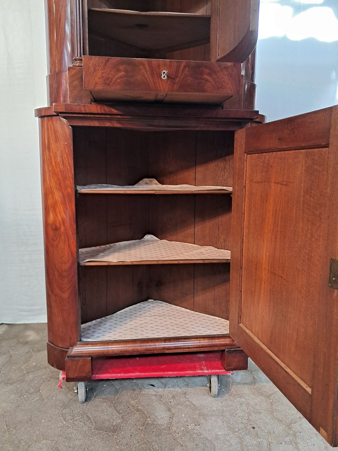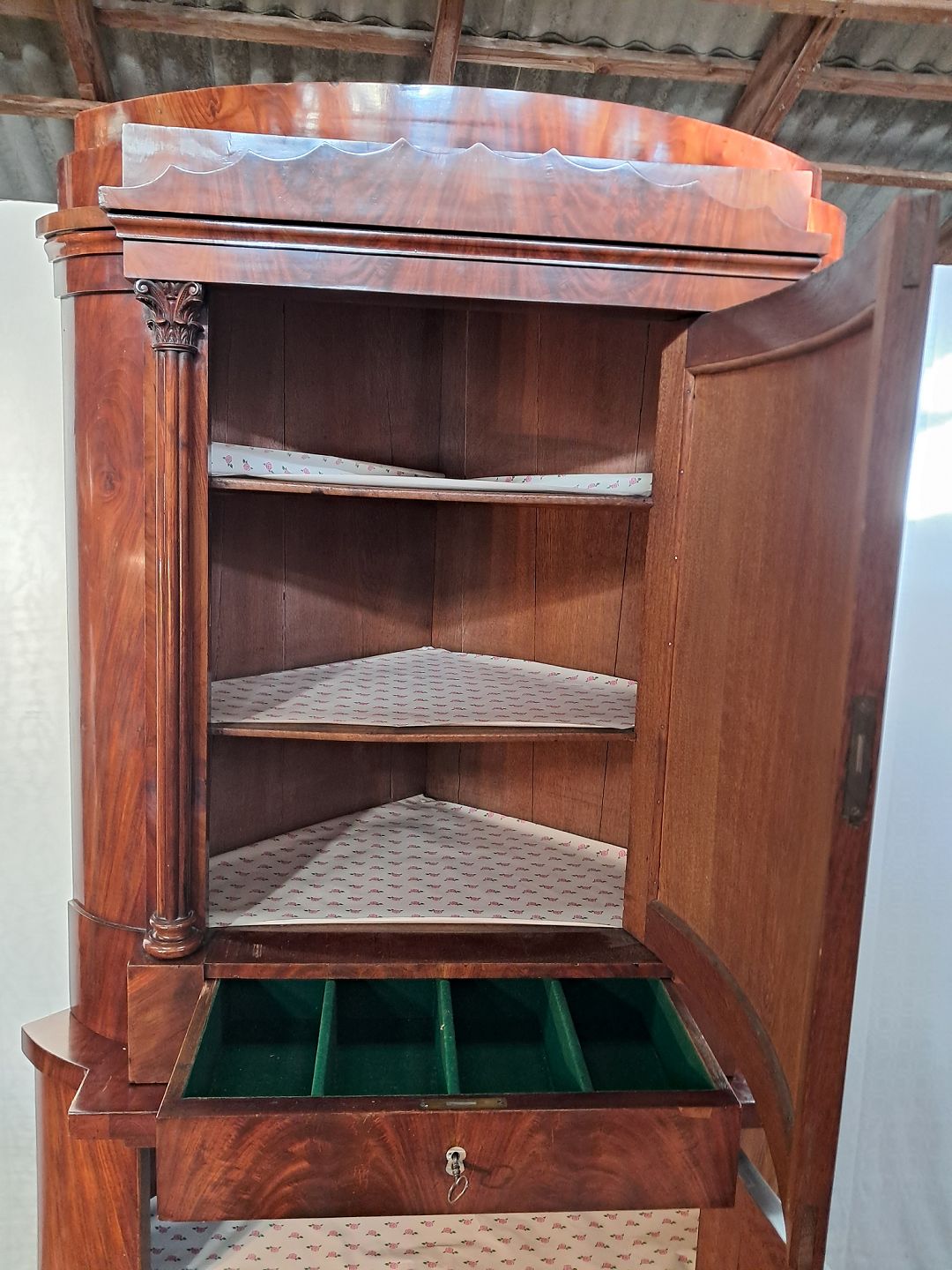 Hjørneskab i fineret mahogni, fra 1890erne.