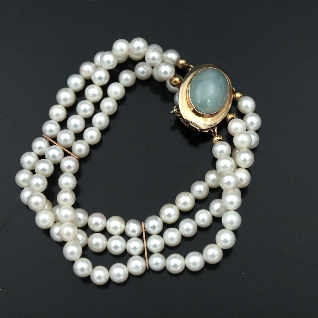 Paul Asger Larsen. Tre-radet perlearmbånd med lås i 14k guld med Jade.