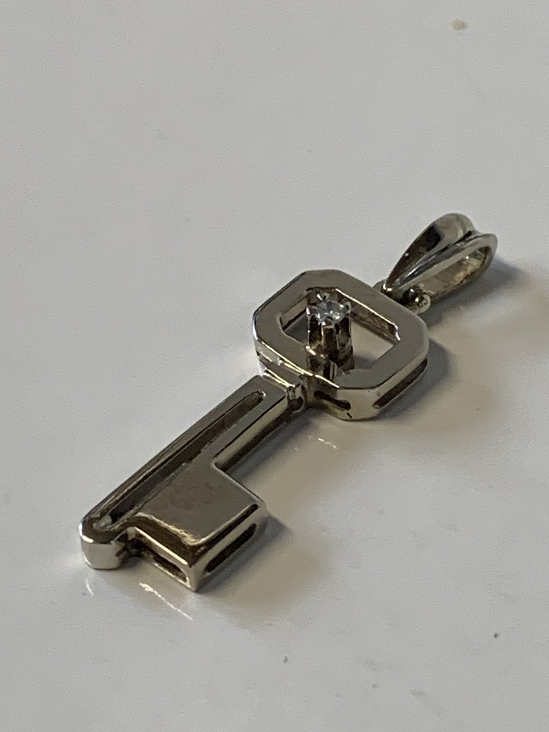 Beautiful and stylish pendant in 14 carat white gold, designed as a key. Detailed and timeless design. The clear lines give the key a strong dynamic impression. The small diamond also adds life to the pendant when the light is reflected.