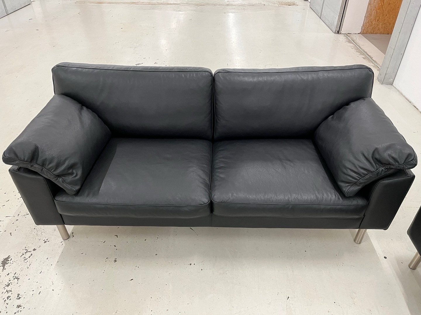 Betrukket med blødt sort okselæder i dessin 668 og understøttet af børstede stålben, tilbyder dette sofasæt en luksuriøs siddeoplevelse. Med koldskum og duntop i sædehynderne får du optimal støtte og komfort, mens de veludformede armhynder sikrer maksimal afslapning.