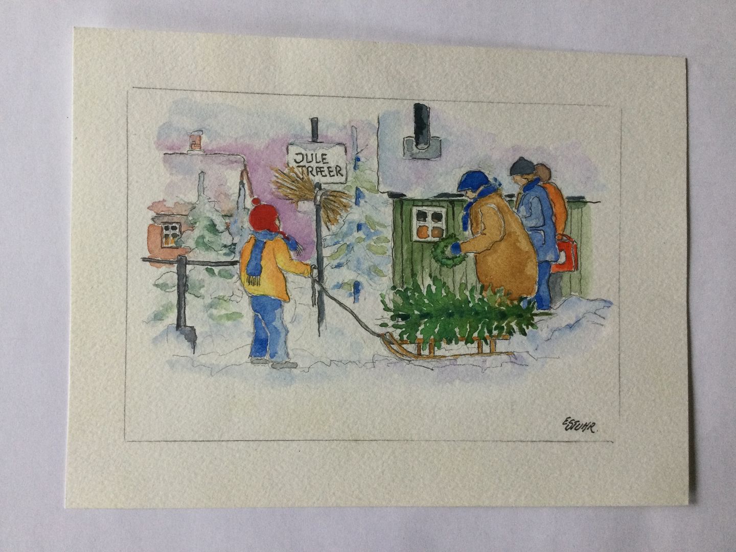 Akvarel af Erik Stuhr - Juletræshandel.