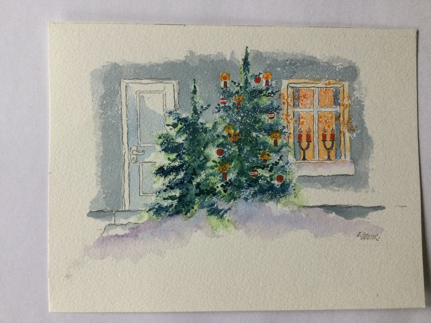 Akvarel af Erik Stuhr - Pyntet juletræ ved julevindue.