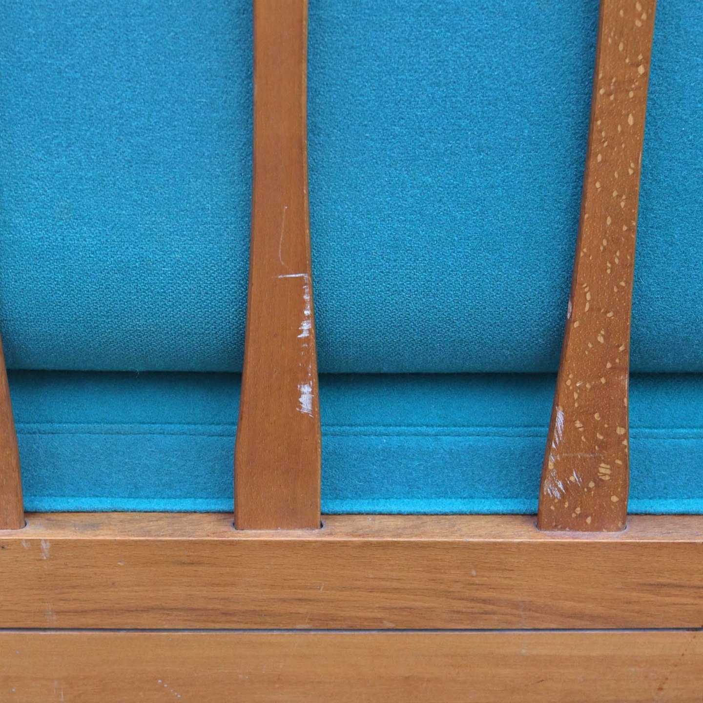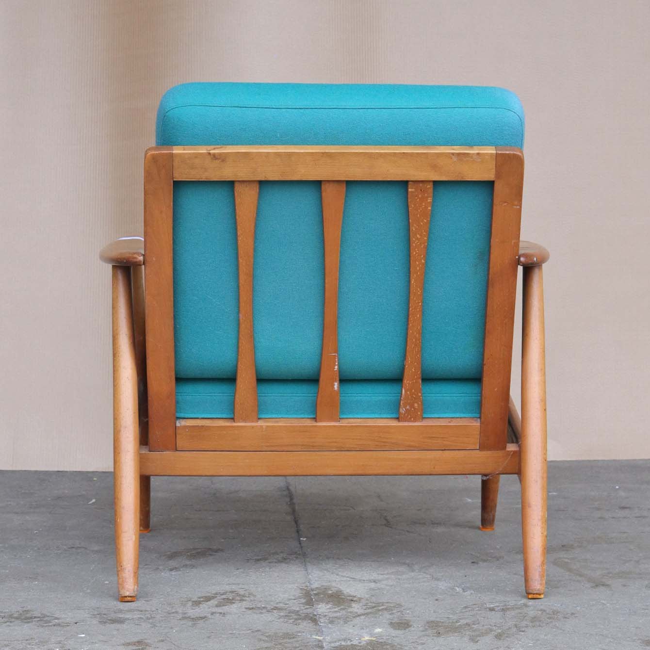Lænestol med stel i lakeret bøgetræ og hynder betrukket med grøn uldstof.