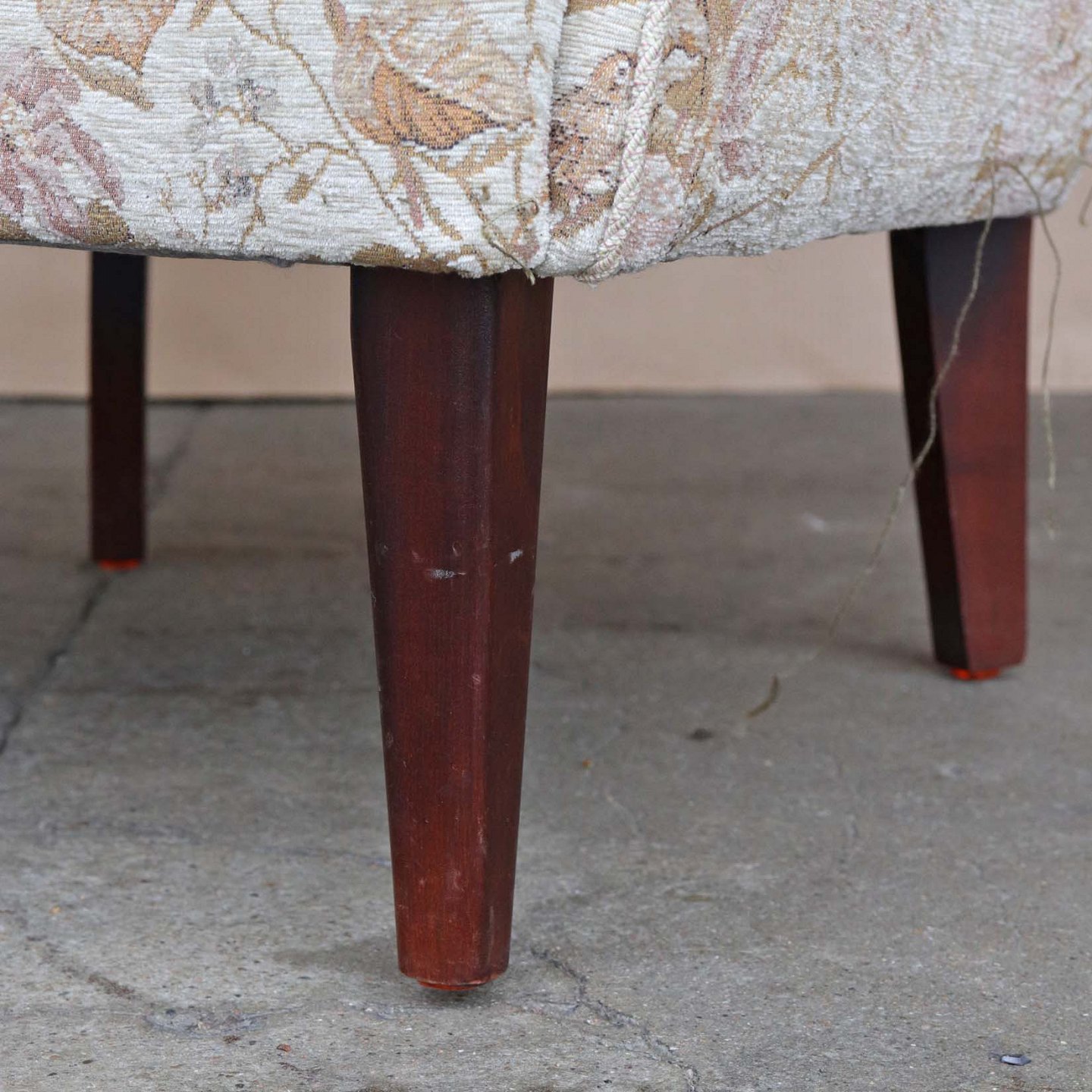 Ældre lænestol med springfjeder sæde betrukket med lyst mønstret stof. Stolen har firkantet tilspidset ben i mørk lakeret træ