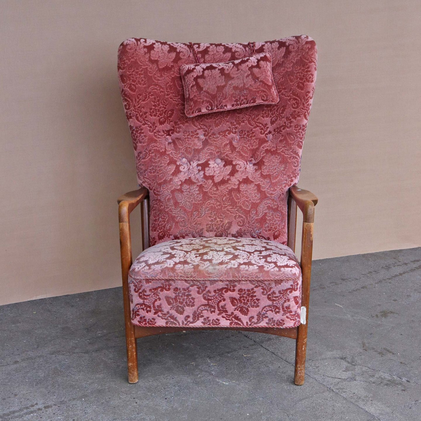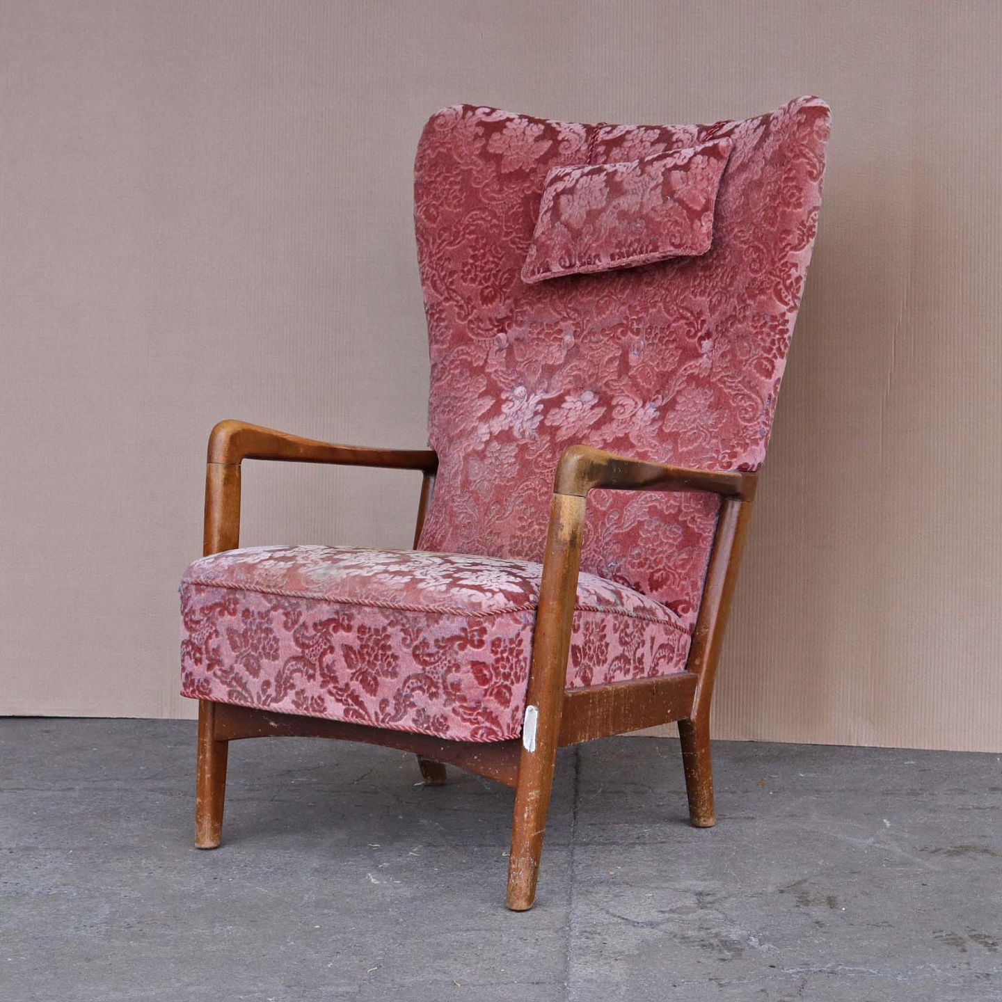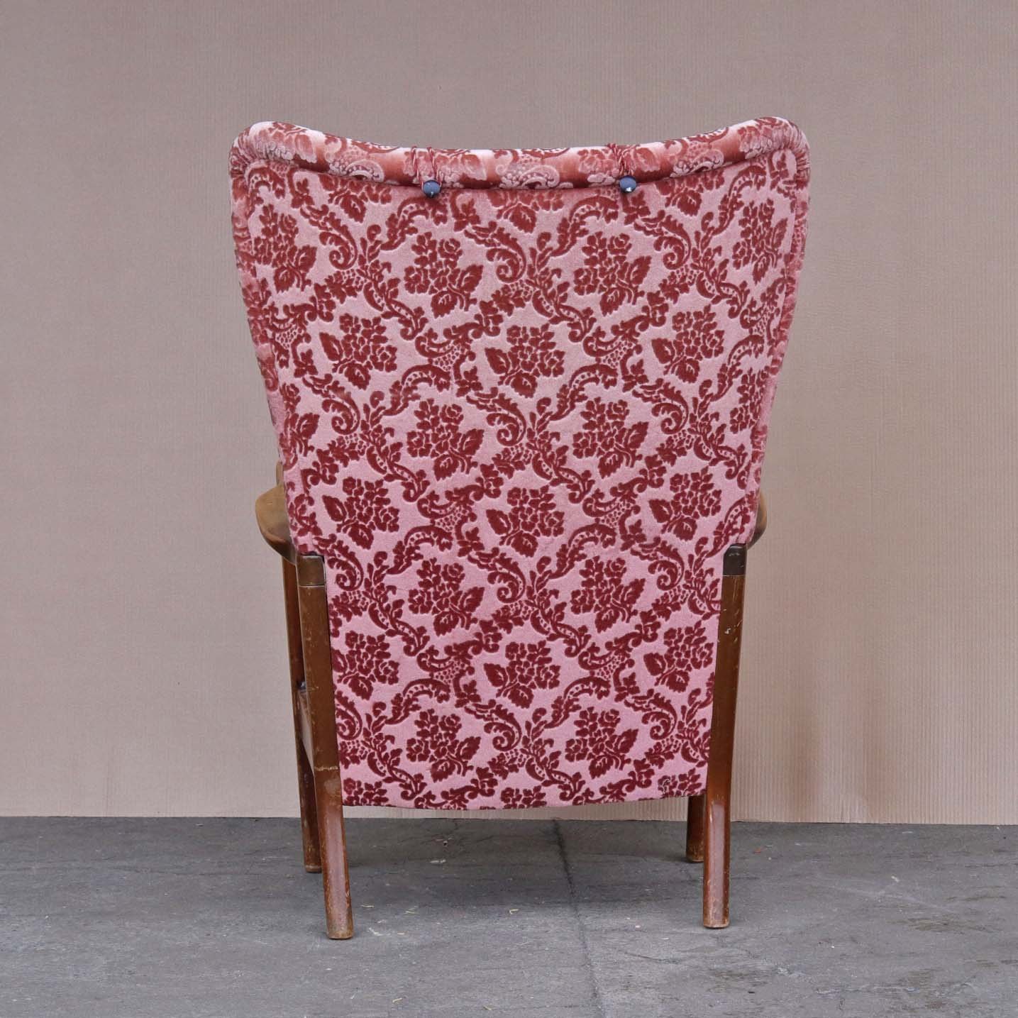 Ældre lænestol med stel i mørk lakeret træ. Stolen er med springfjeder sæde og er betrukket med rosa og rødt struktureret stof. Den kommer med tilhørende nakkepude
