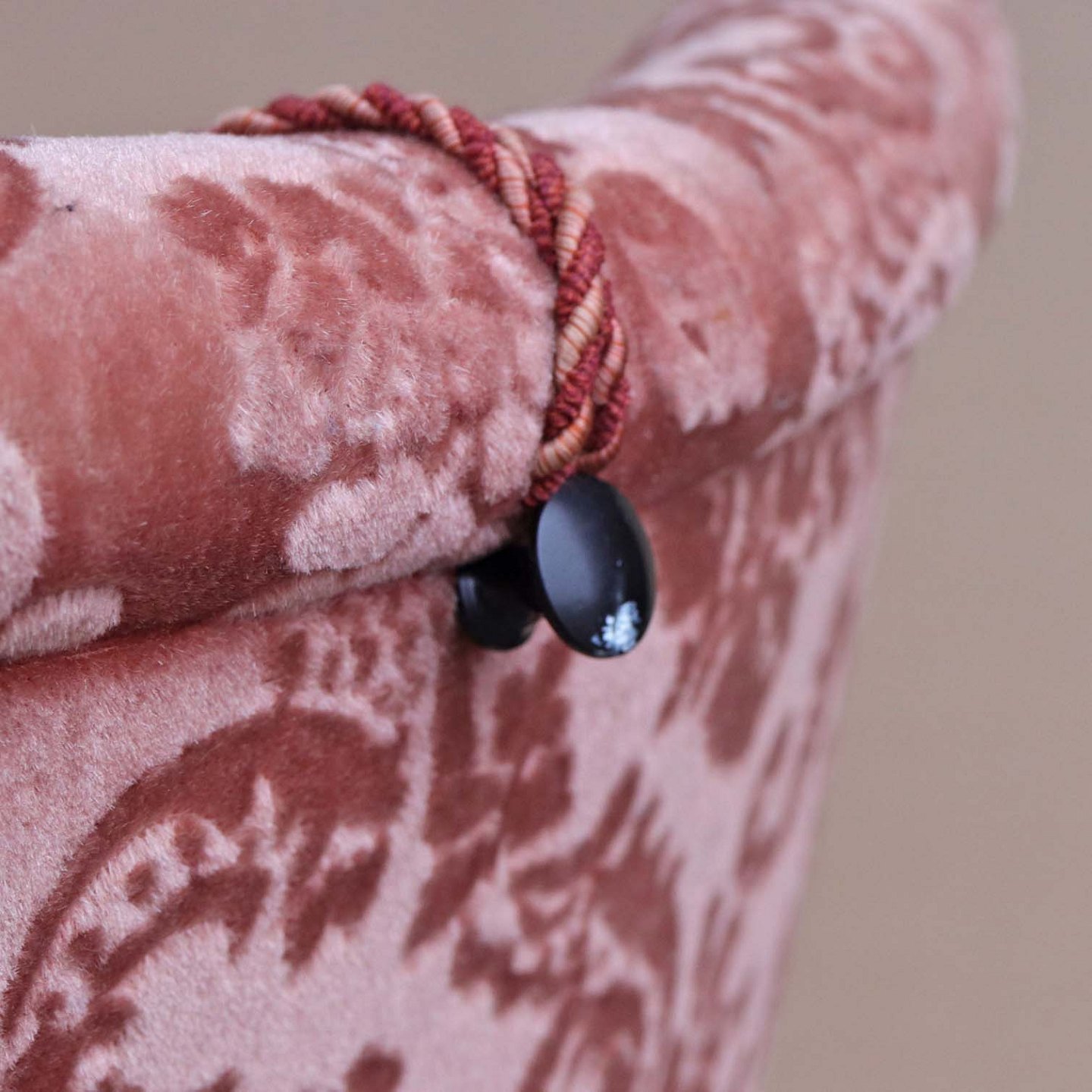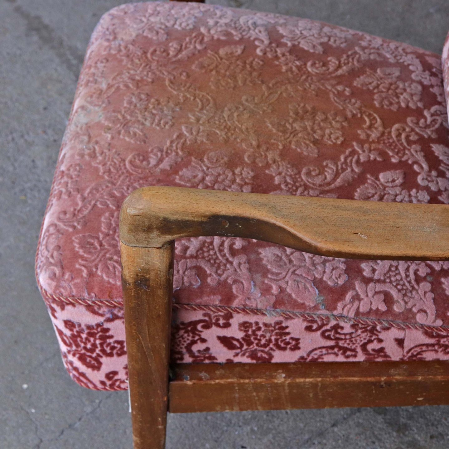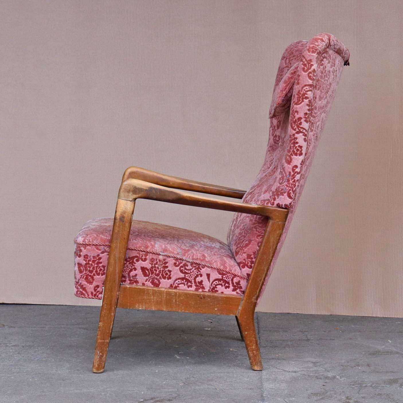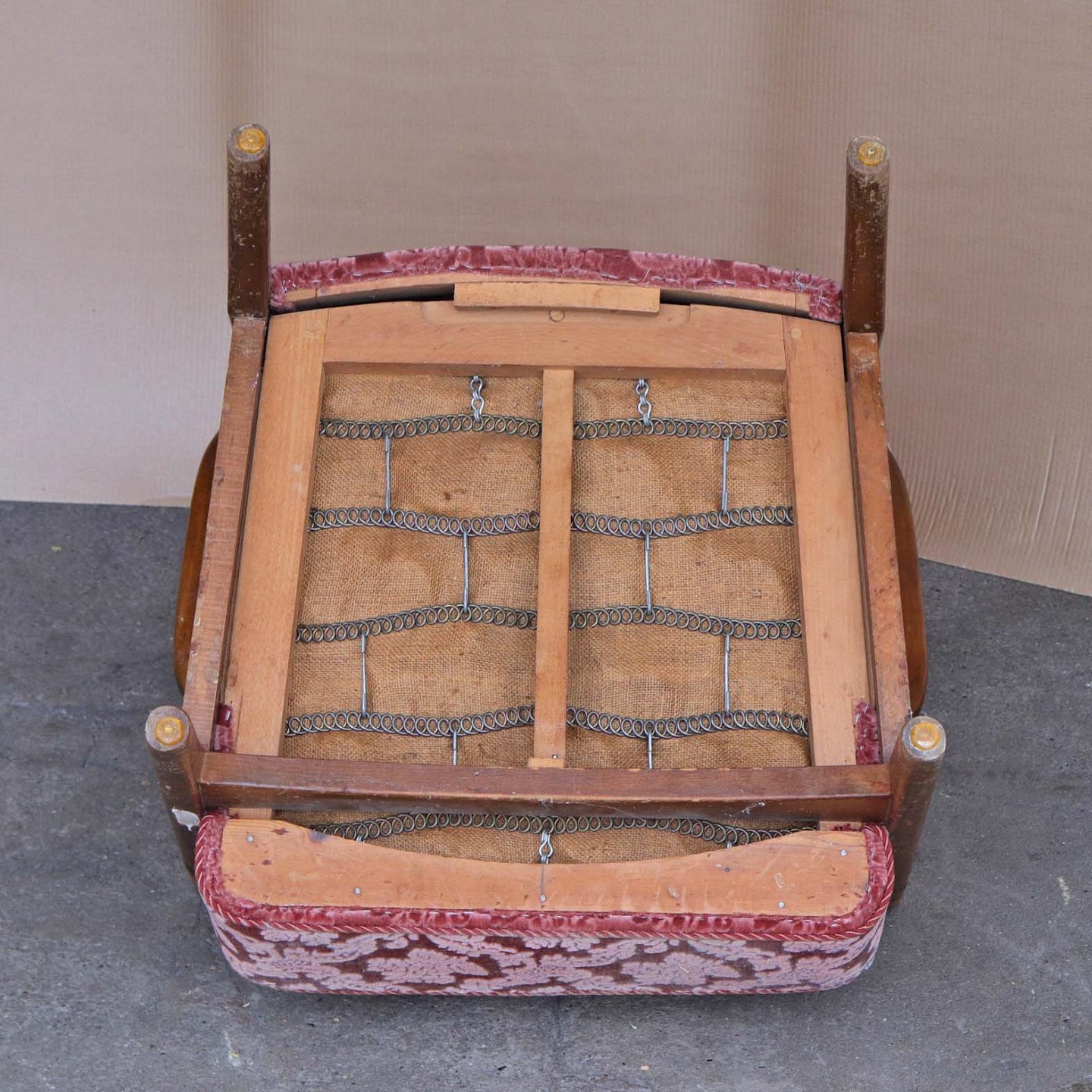 Ældre lænestol med stel i mørk lakeret træ. Stolen er med springfjeder sæde og er betrukket med rosa og rødt struktureret stof. Den kommer med tilhørende nakkepude