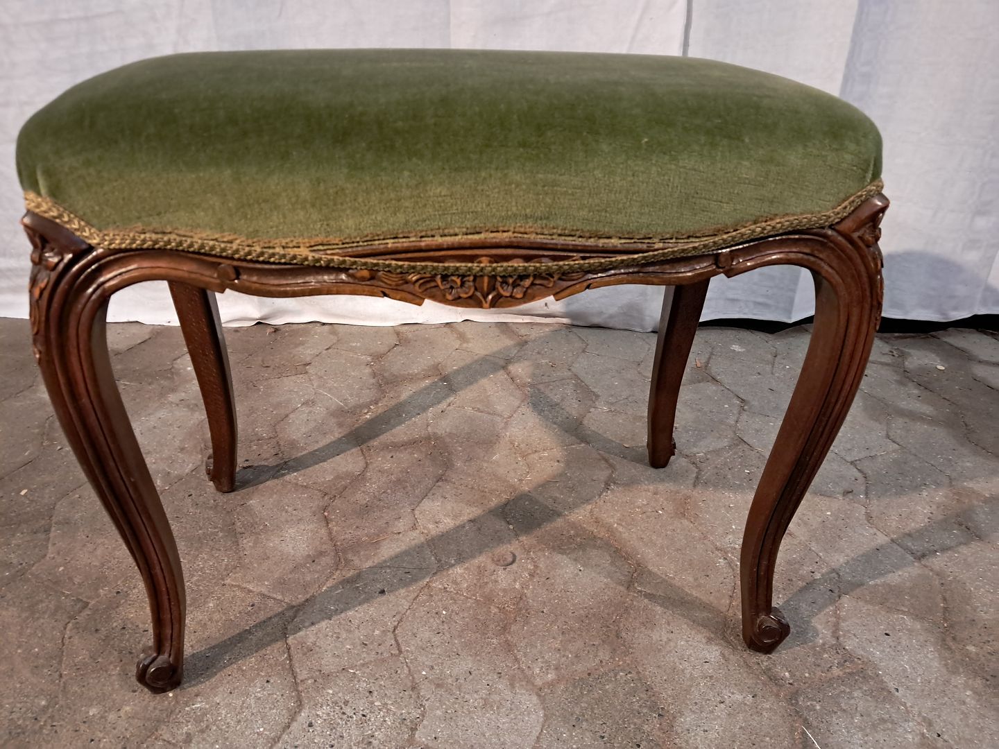 Skammel i massivt bøgetræ med velour betræk, fra 1980erne.