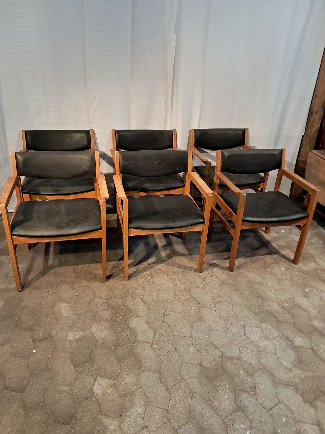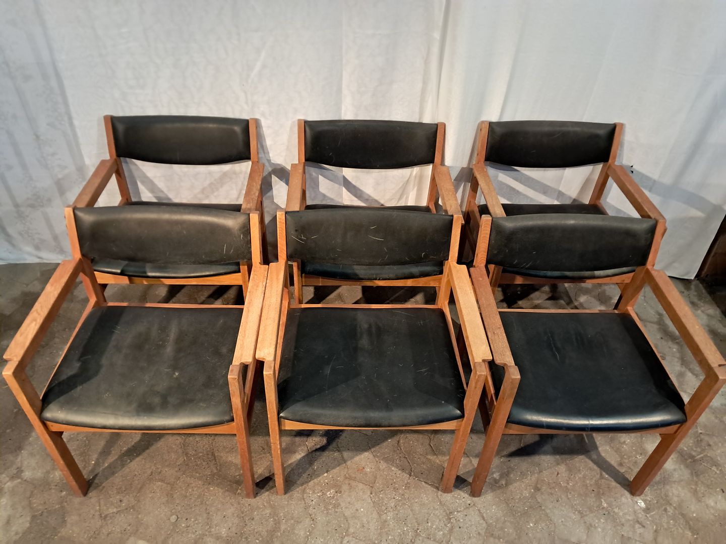6 Armstole i massivt egetræ med læderbetræk, fra 1970erne.