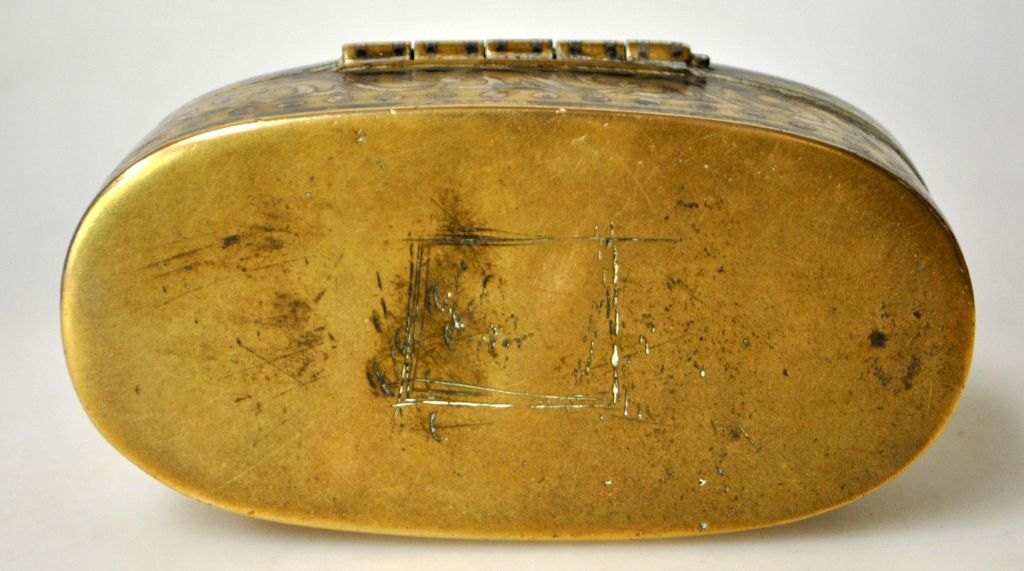 Asiatisk beholder til betel og brændt kalk, 19. årh. Messing med indlagt sølv i mønstre. Oval. L. 11,5 cm. B.: 5,7 cm. H.: 4 cm.
