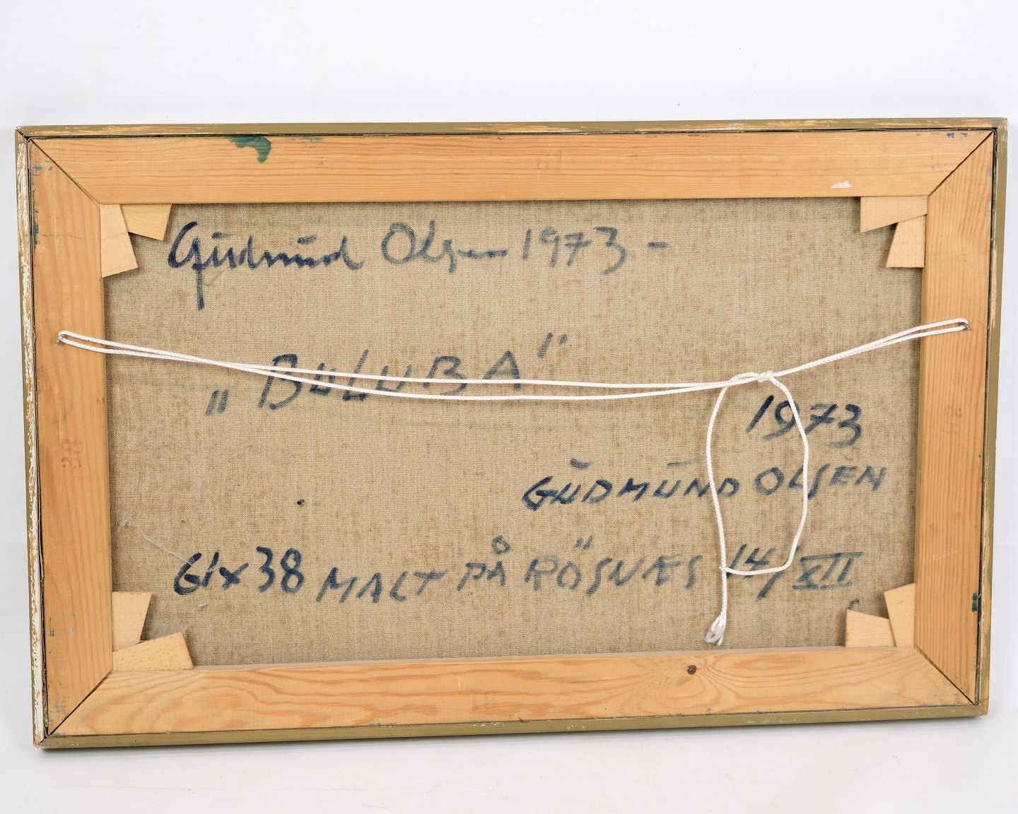 Indrammet i en smal, guldfarvet ramme, understreges værkets elegance og dybde. Gudmund Olsens arbejde er kendt for at udforske farvespil og teksturer, hvilket gør dette maleri til et spændende og unikt tilføjelse til en samling af moderne kunst.