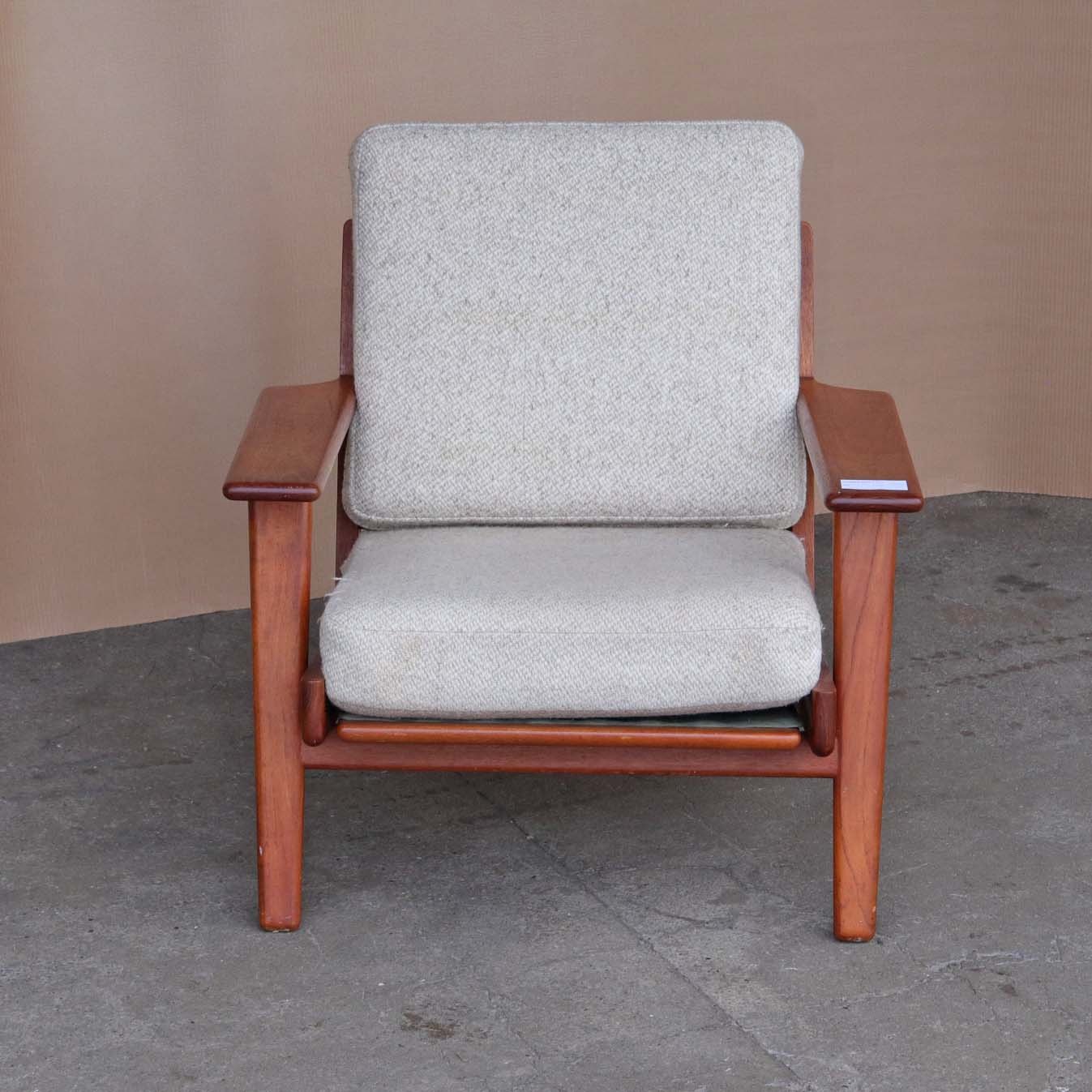 Lænestol med stel i lakeret teaktræ og hynder med springfjeder. Hynderne er betrukket med meleret råhvidt uldstof. Model GE 290