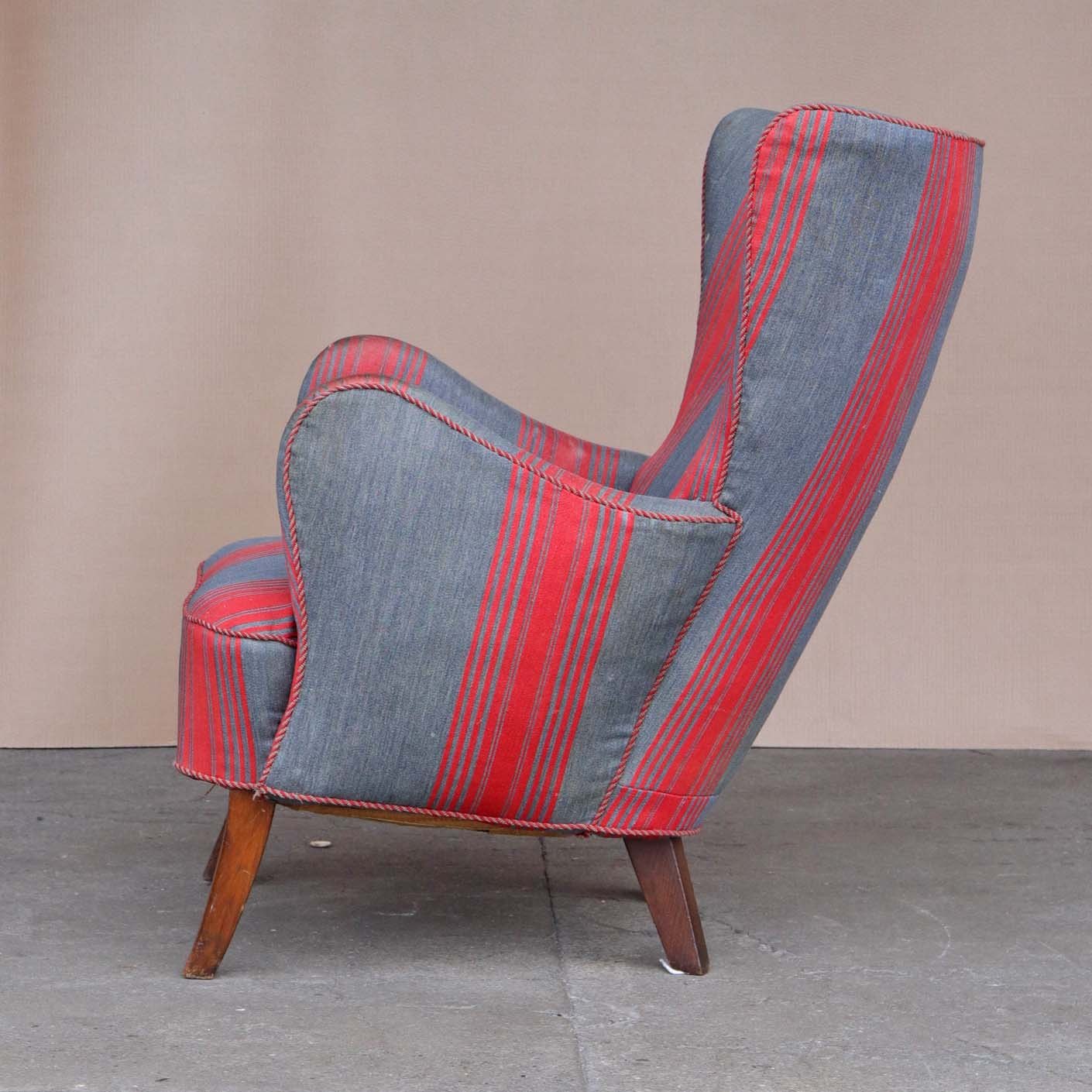 Ældre lænestol med springfjeder sæde og ben af mørk lakeret træ. Stolen er betrukket med gråt og rød stibet stof