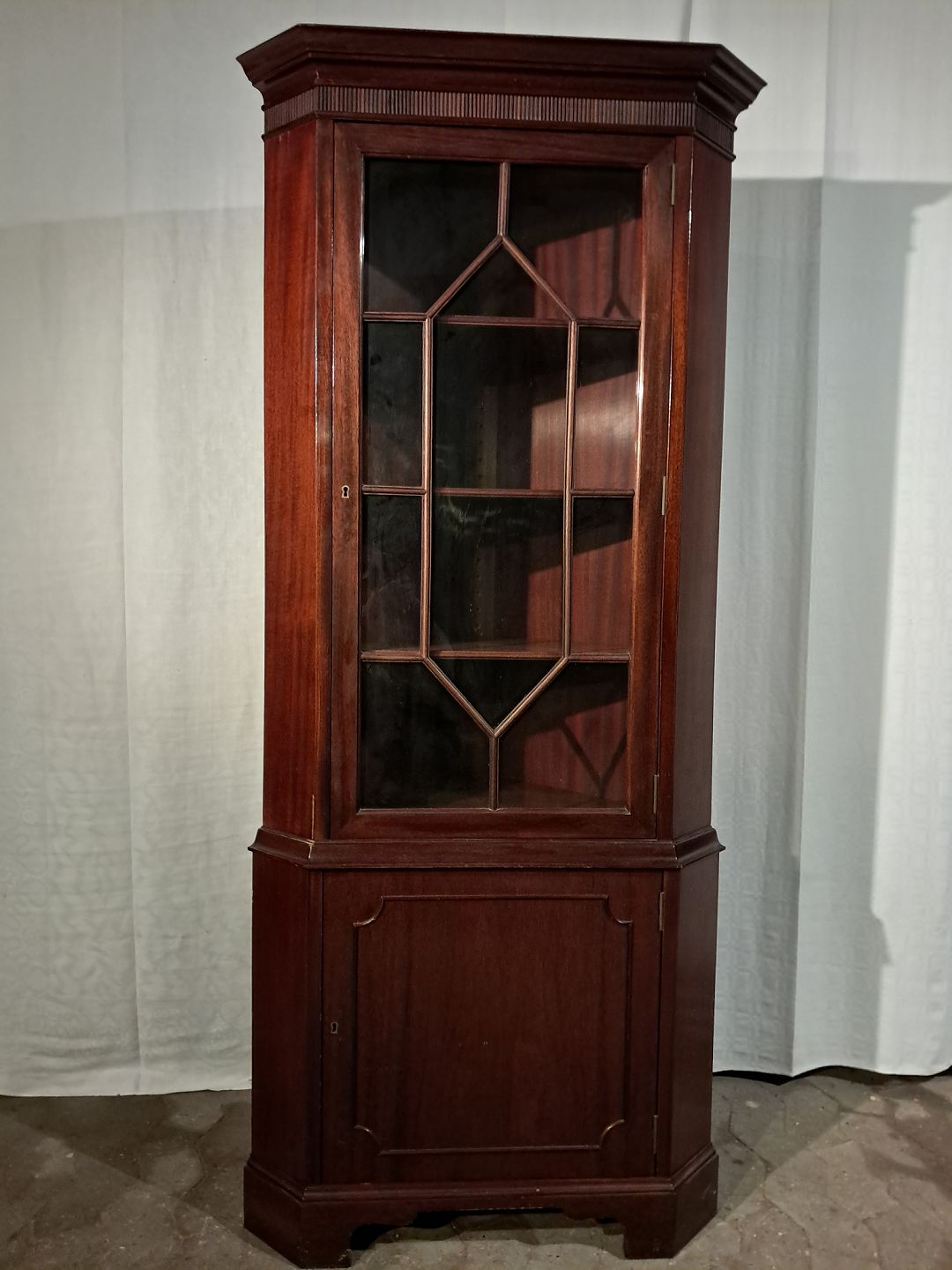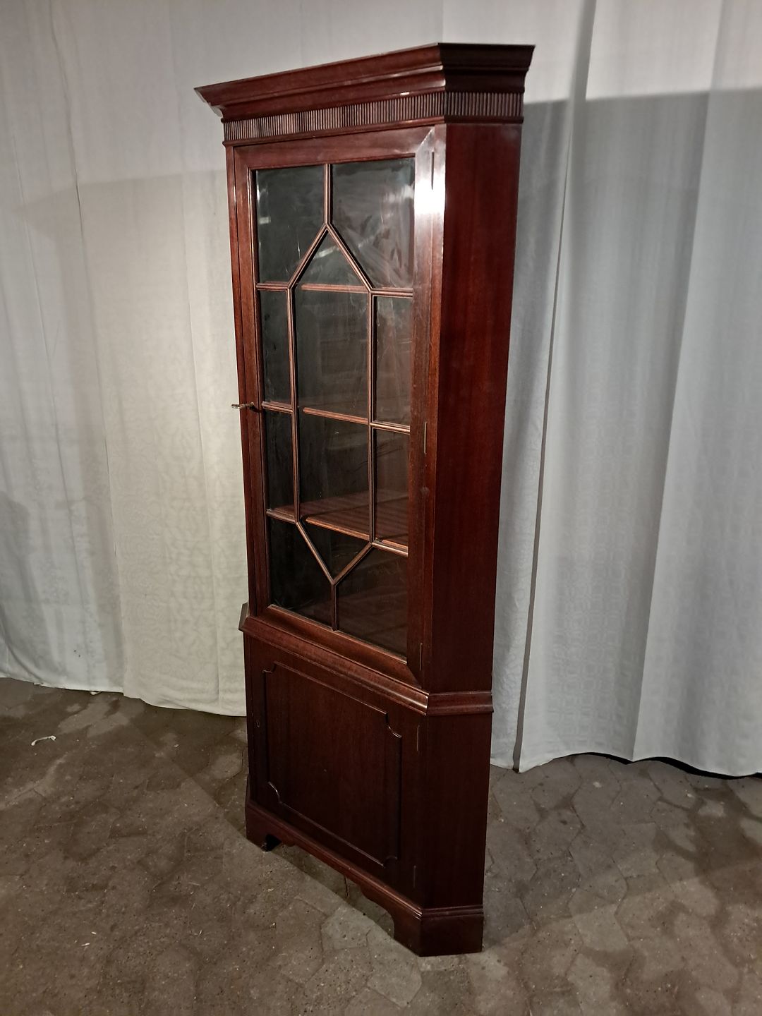 Hjørneskab i fineret mahogni, fra 1980erne.