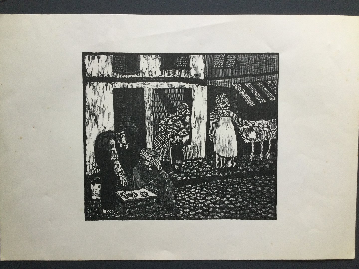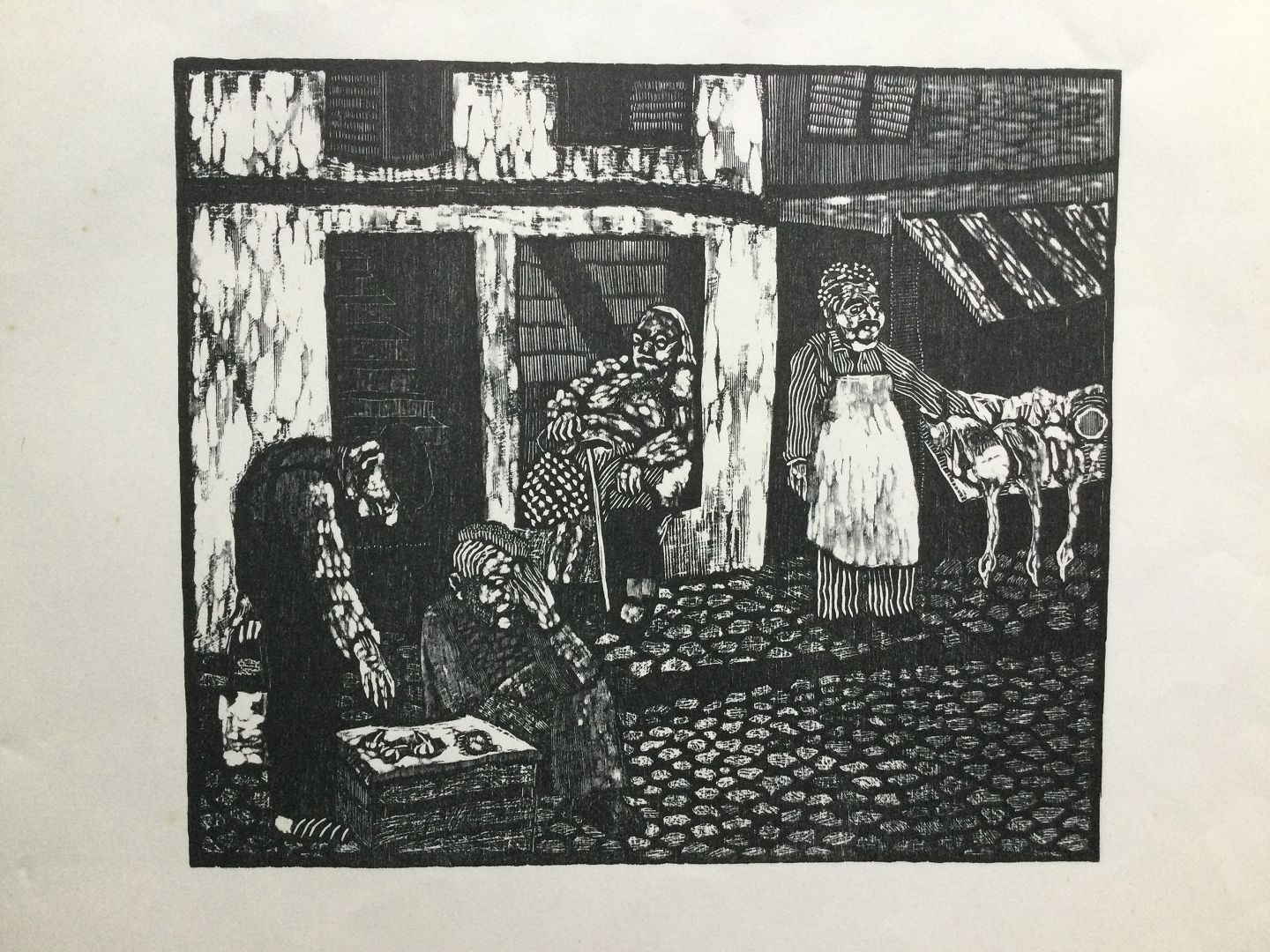 Træsnit Helle Vibeke Erichsen - Markedsscene.