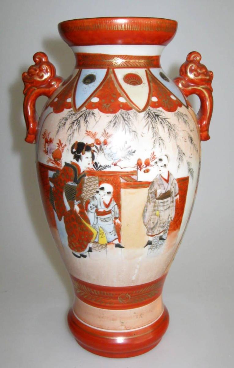 Pair satsuma vases, about 1900 Japan. Polychrome decoration with scenes of birds and woman and two children. With handles. H .: 26 cm. Signed. Flawless!