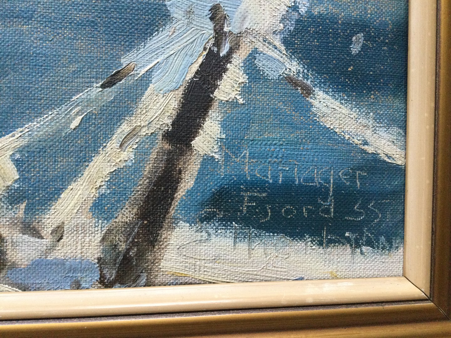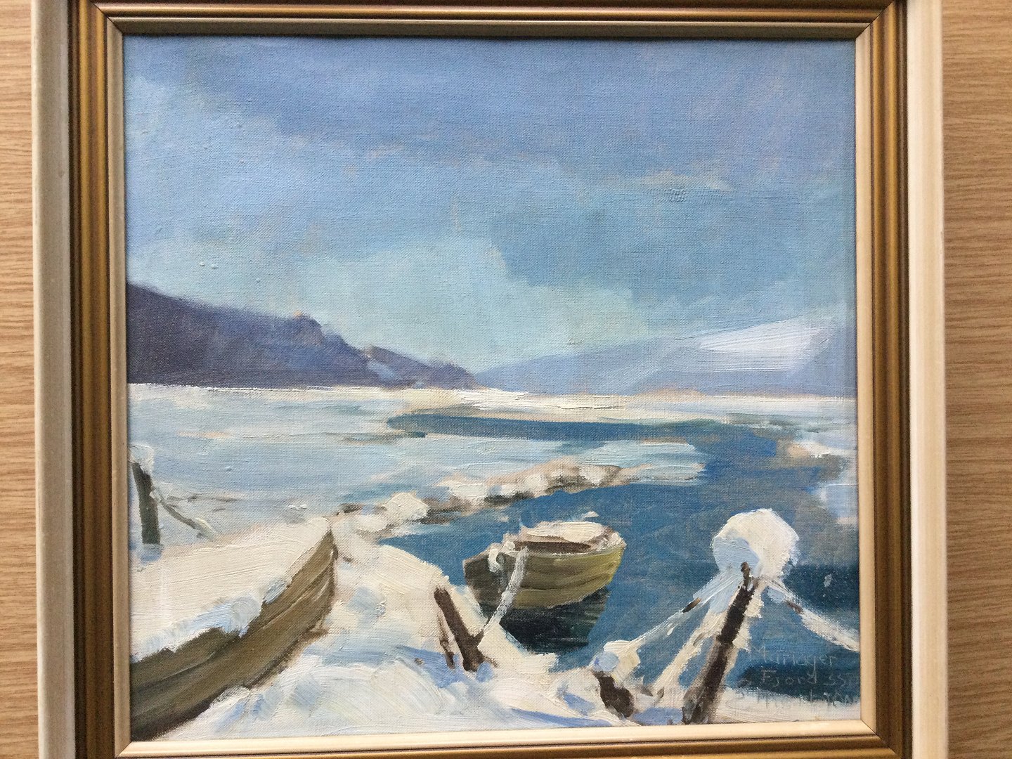 Maleri af E. Thorbjørn 1955 - Vinterparti fra Mariager Fjord.