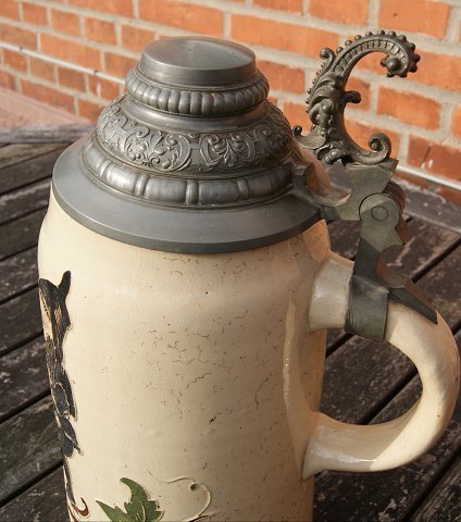 Pæn og velholdt stort ølkrus i fajance med tinlåg.