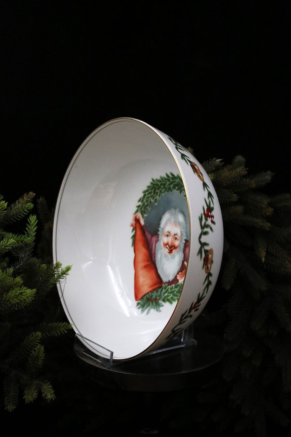 Stor Bing & Grøndahl Juleskål med julemotiver , nissemand i bunden af skålen og granguirlander , julehjerter og bagte kringler på ydesiden af skålen. H: 10,5cm. Dia.: 26,5cm.