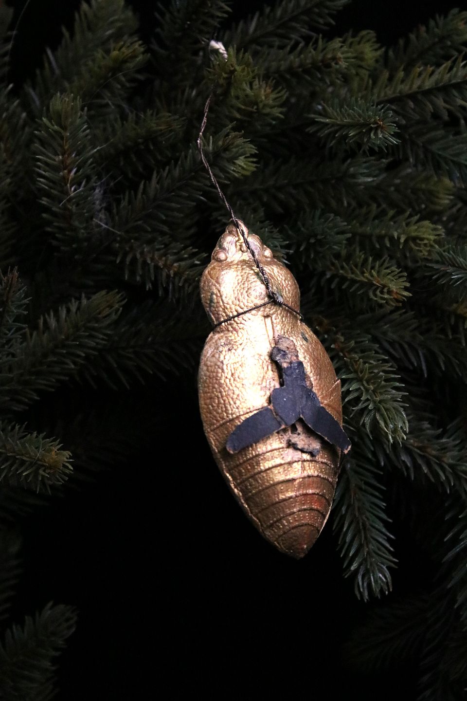 Antik Dresden julepynt i form af skarnsbille i guldbelagt papmache fra år 1900.