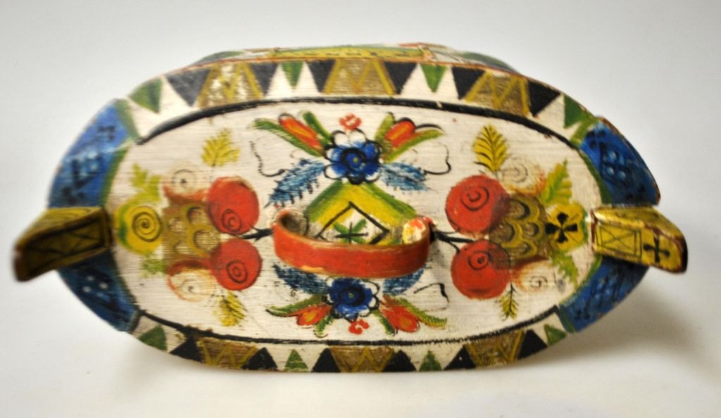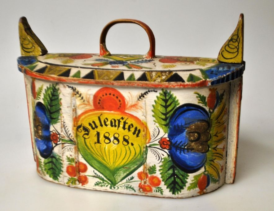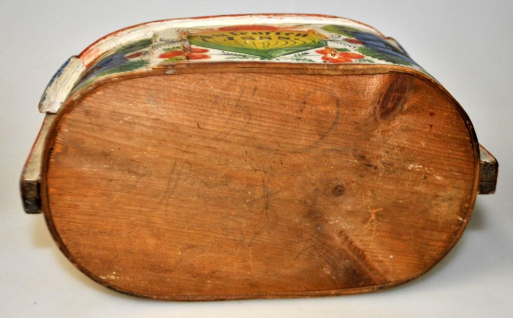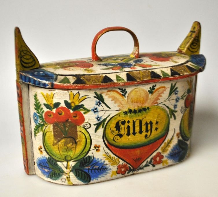 Bemalet madtejne, 1888, Danmark. Polykrom bemalet med årstal og navnet Lilly. Oval, spån fyrretræ. L: 18,5 cm. H.: 13,5 cm.