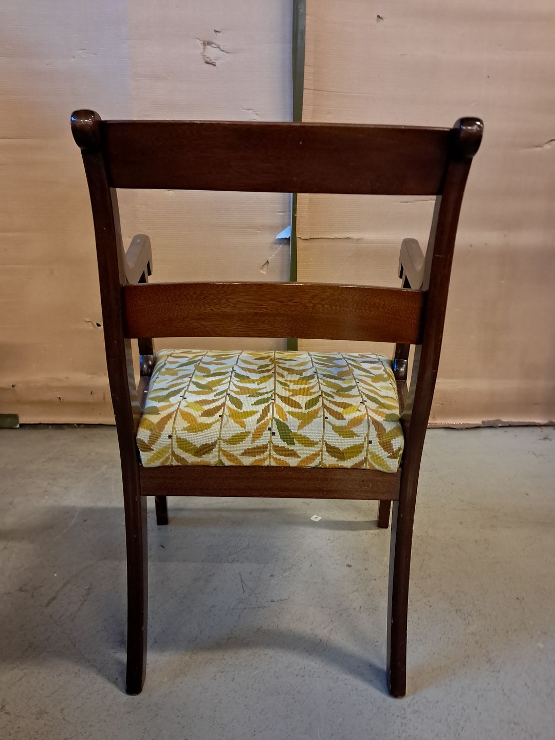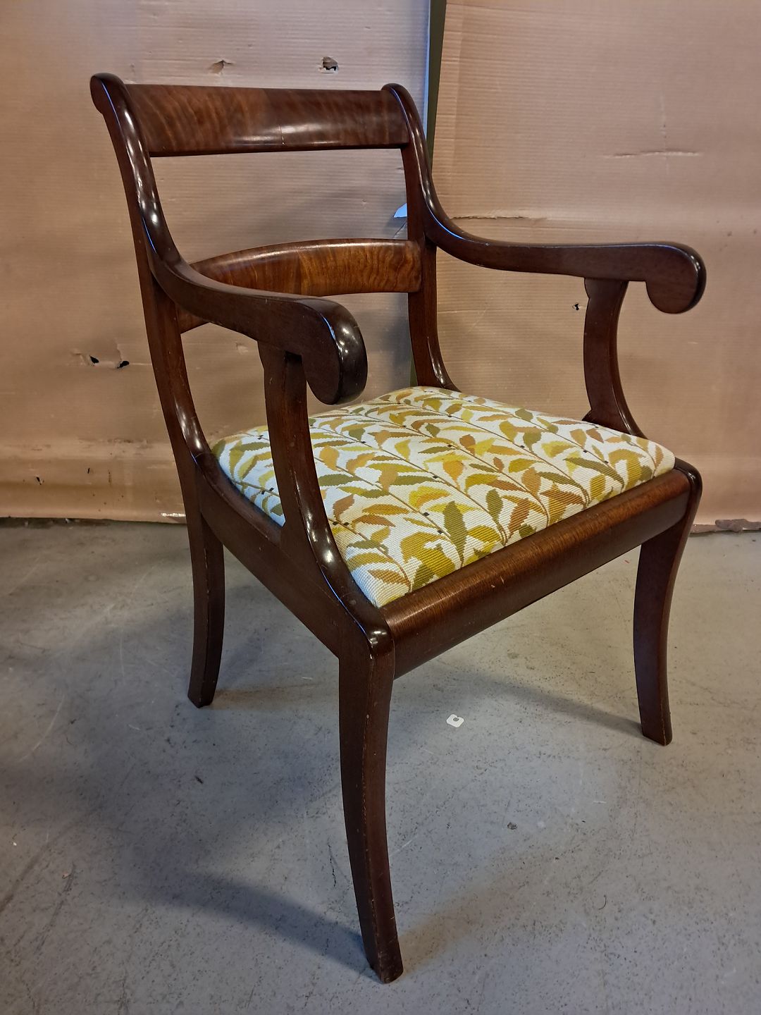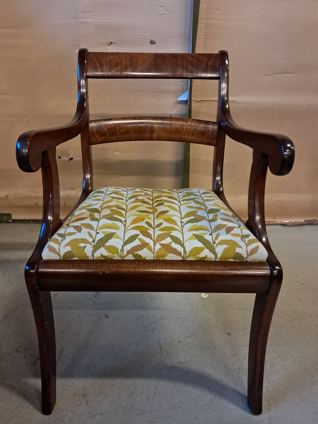 Armstol i mahogni og bøgetræ med broderet betræk, fra 1910erne.