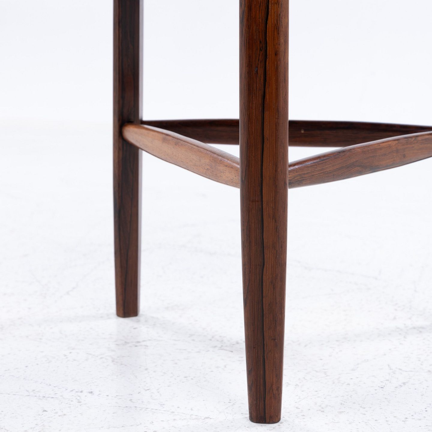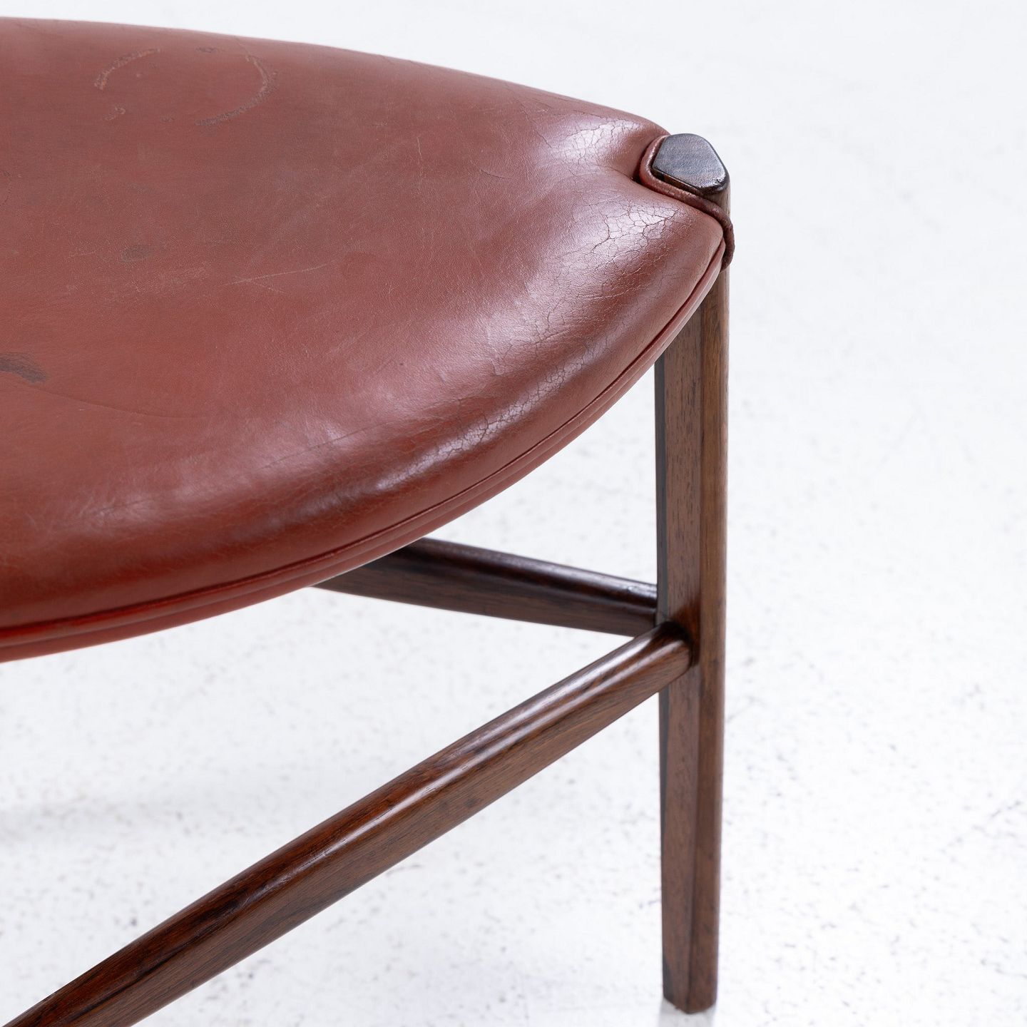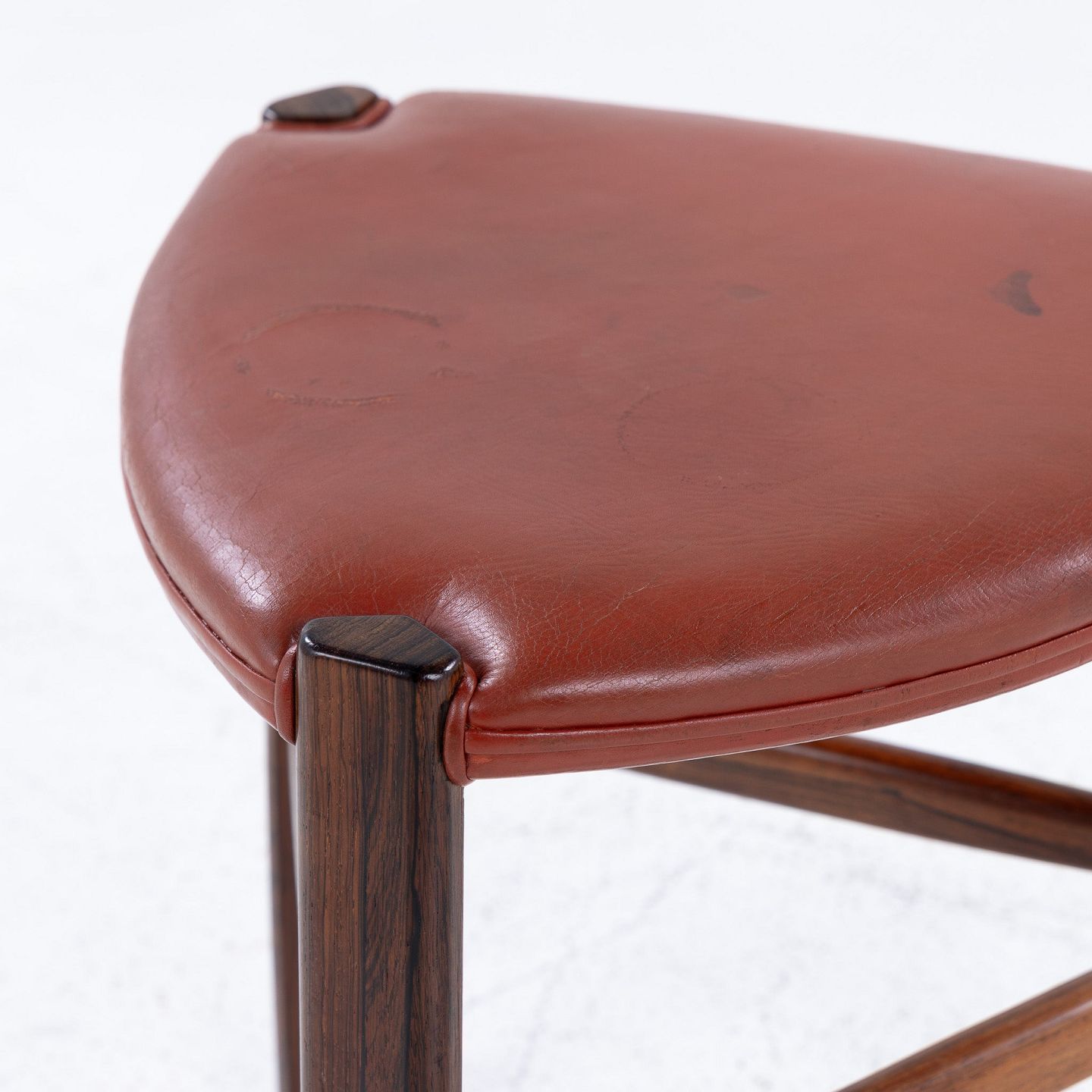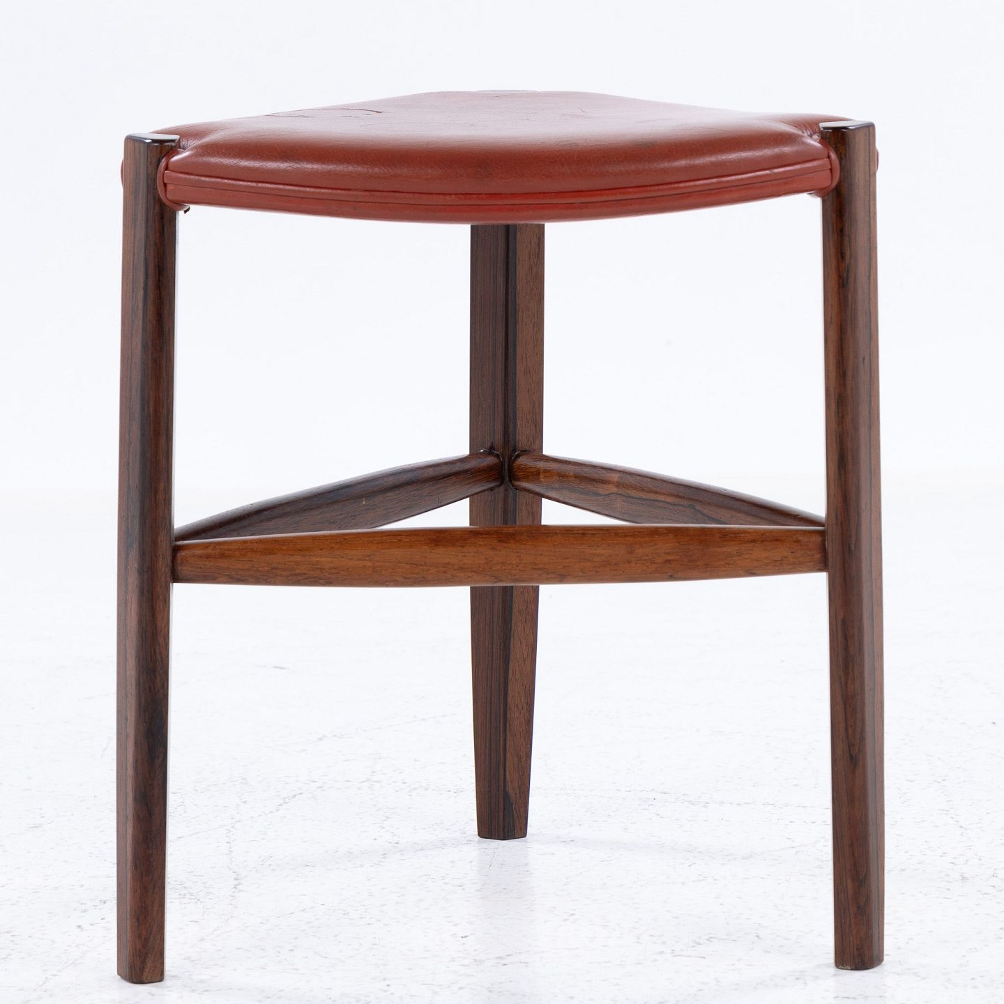 Skammel med tre ben i palisander og rødt læder.