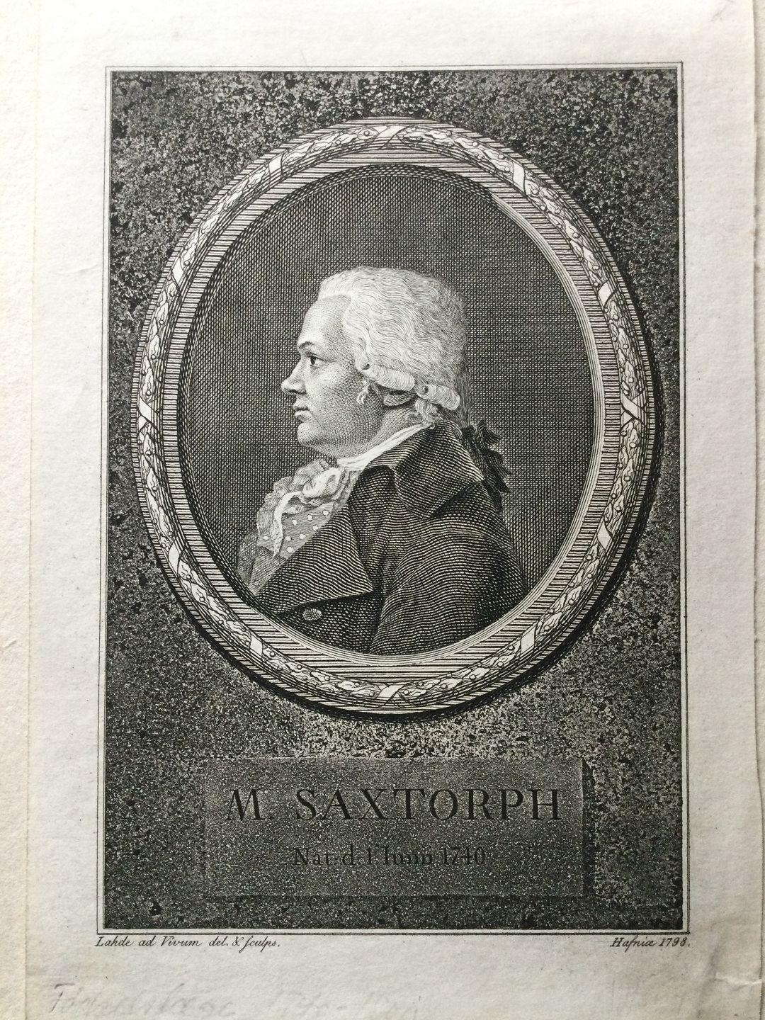 Text available in Danish: Kobberstik 1798 af G.L. Lahde - Portræt af Fødselslægen Matthias Saxtorph