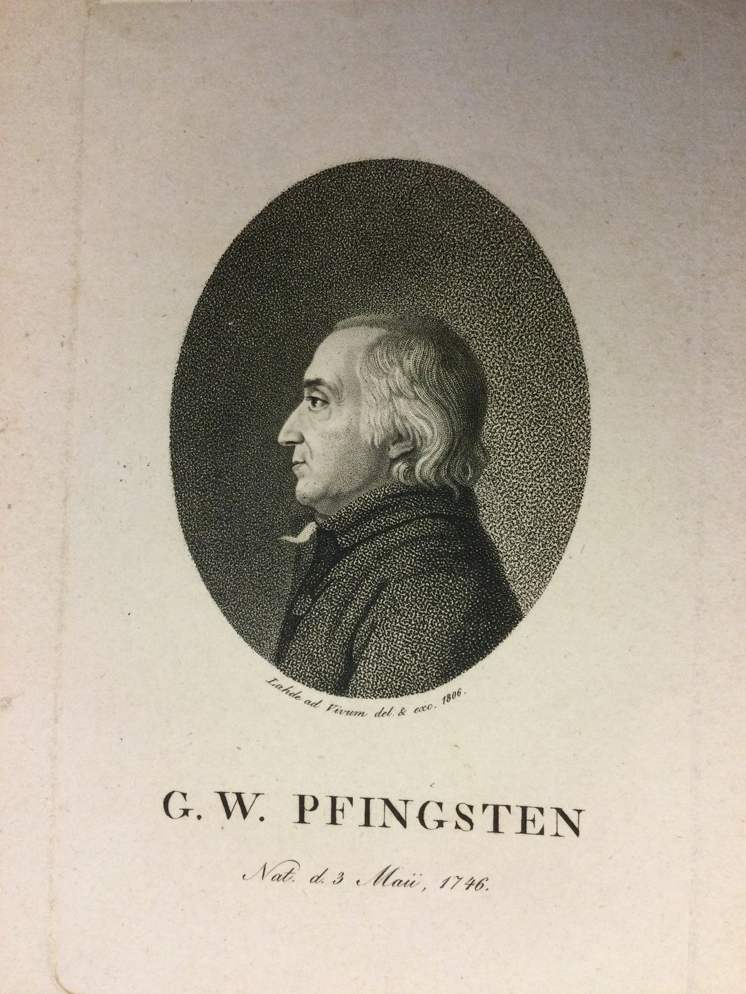 Text available in Danish: Kobberstik af G.L. Lahde 1806 - Portræt af Døvstummelærer Georg Wilhelm Pfingsten.