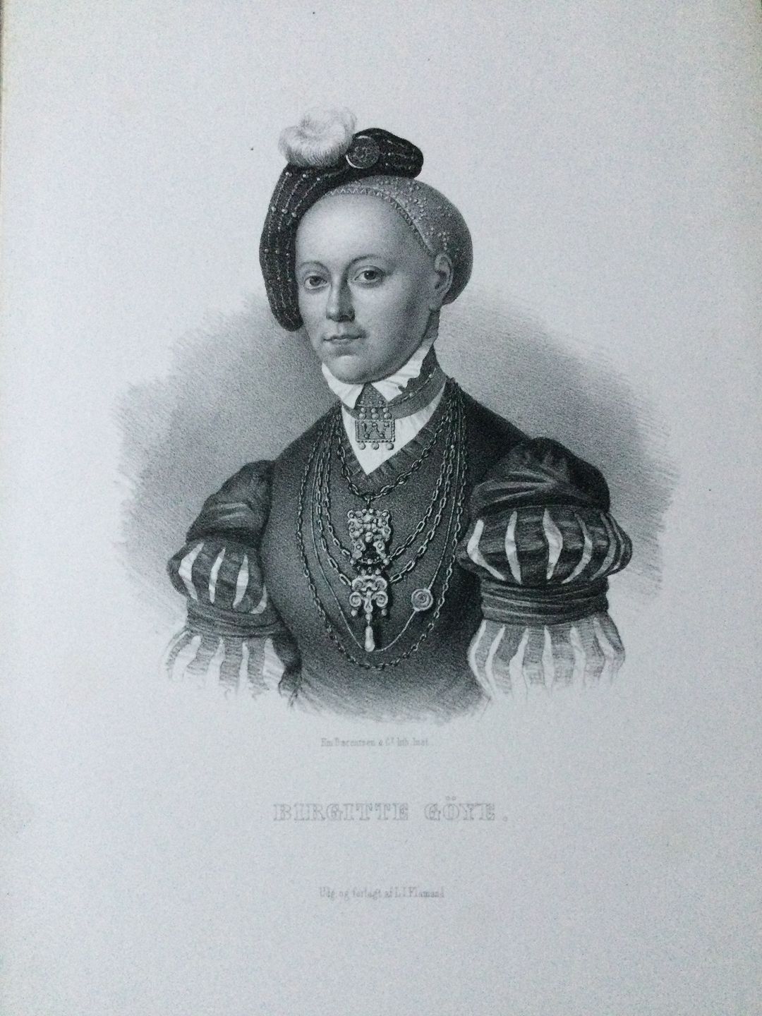 Litografi af Em. Bærentzen - Portræt af Hofdame og godsejer Birgitte Gøye.