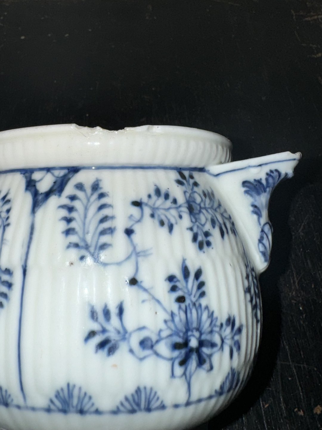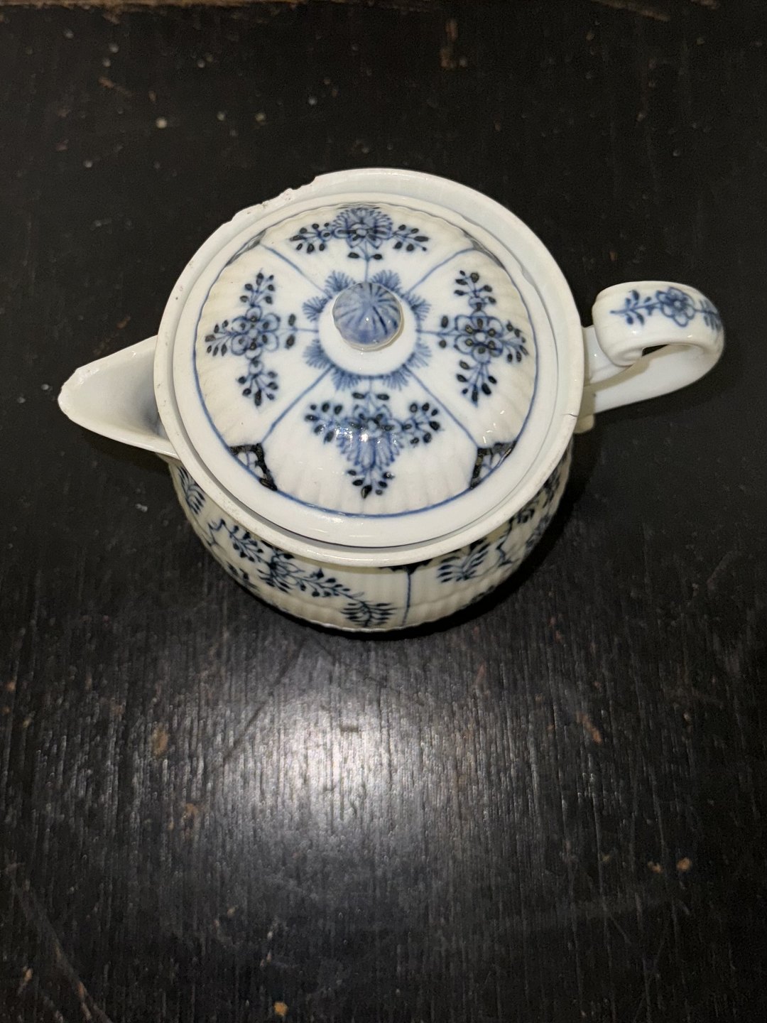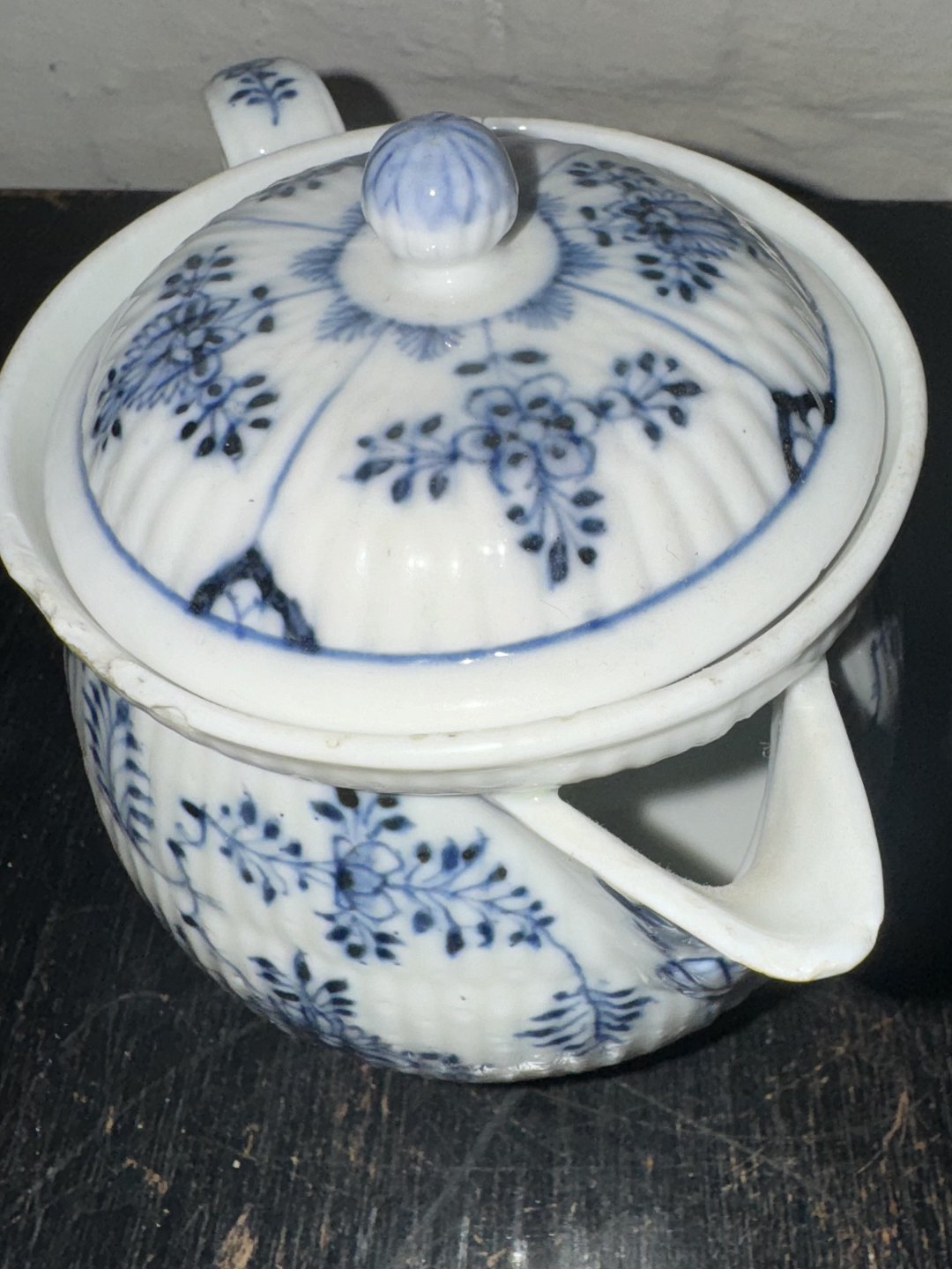 Jug with lid standing on three feet. Blue fluted decoration. Made around 1800 at the Meissen factory In Germany. Several chips, which can be seen in the photos. Dimensions: H. 13.5 cm including lid.