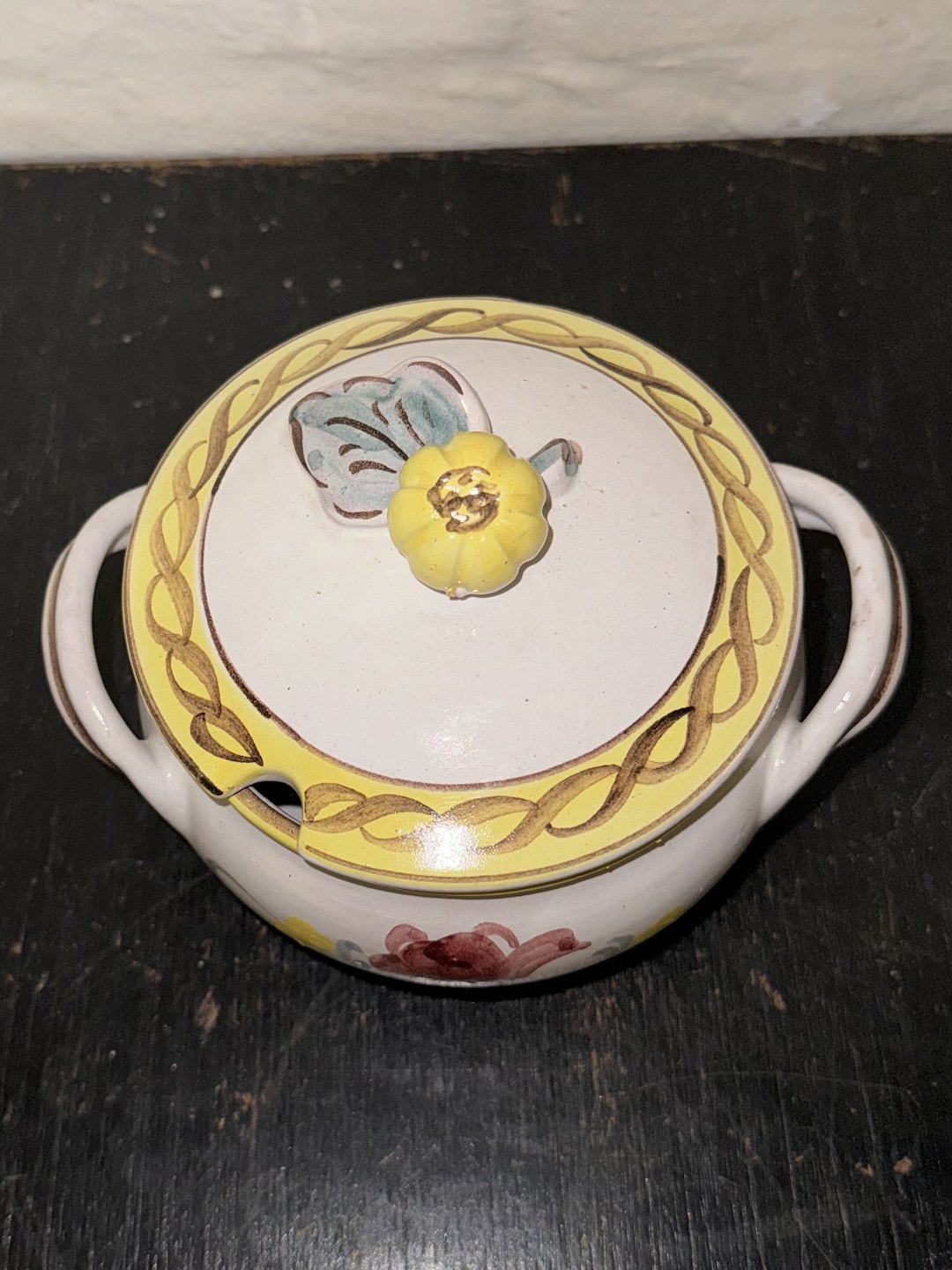 Blomsterbemalet keramik terrin med låg fra Lars Syberg. I perfekt stand. Fabriksmærket på bunden. Mål: H. 12,5 cm Fra øre til øre 16 cm