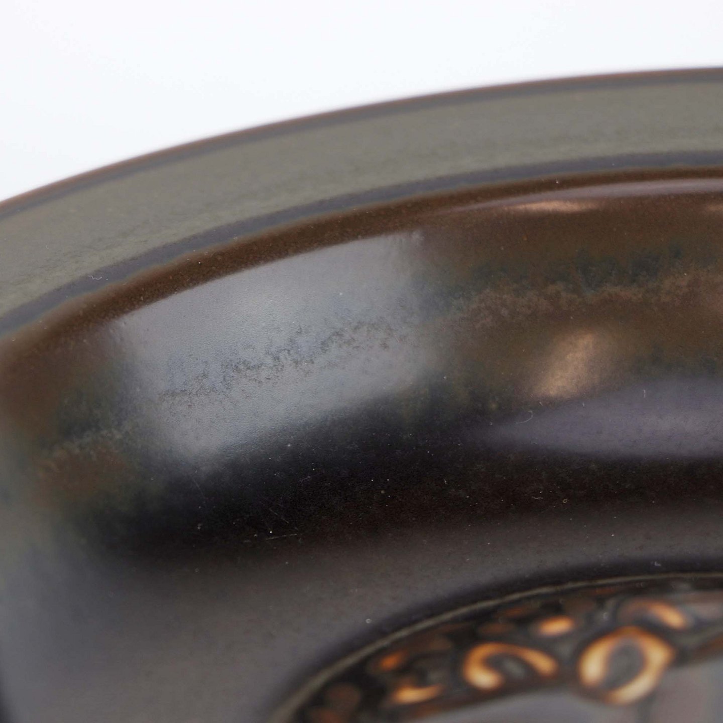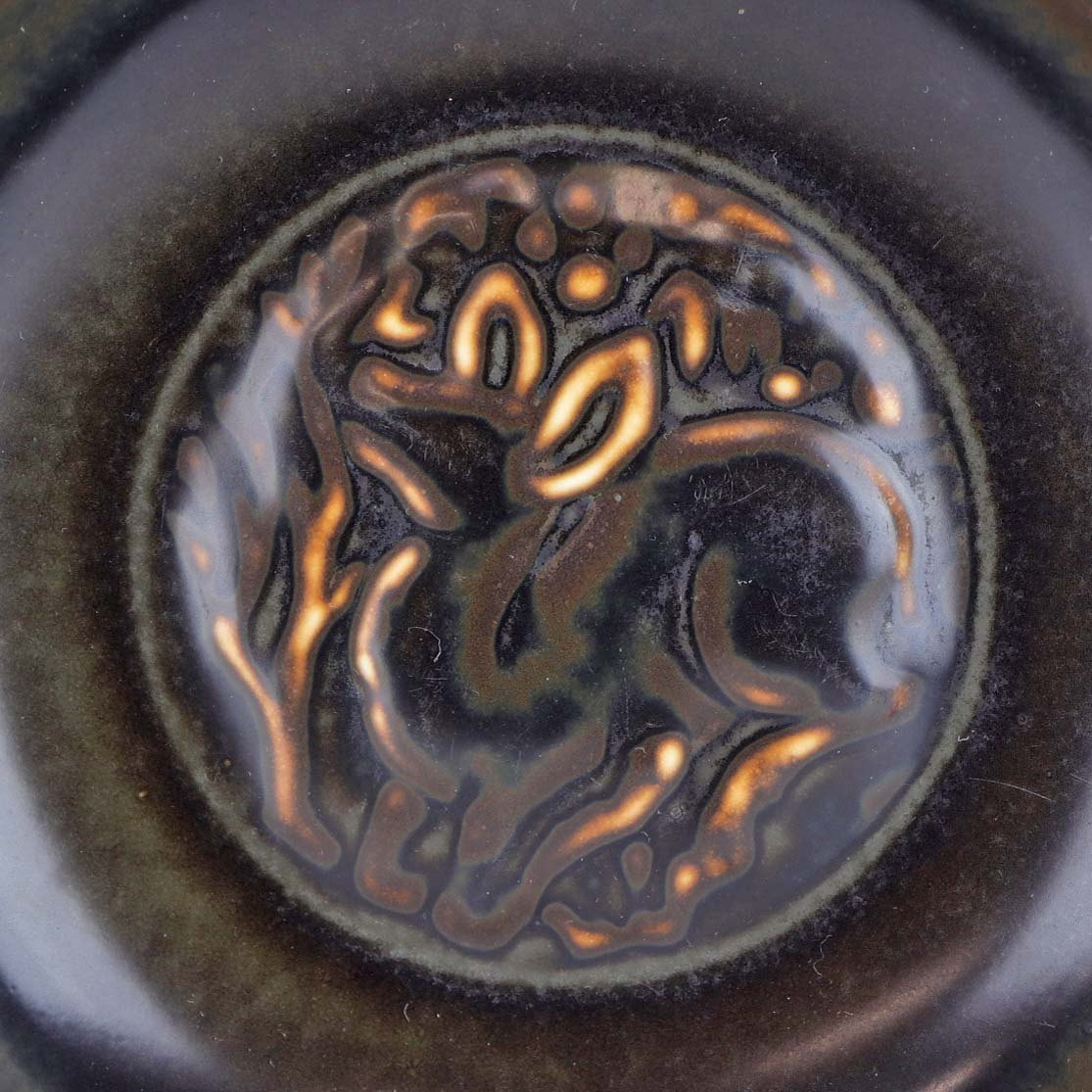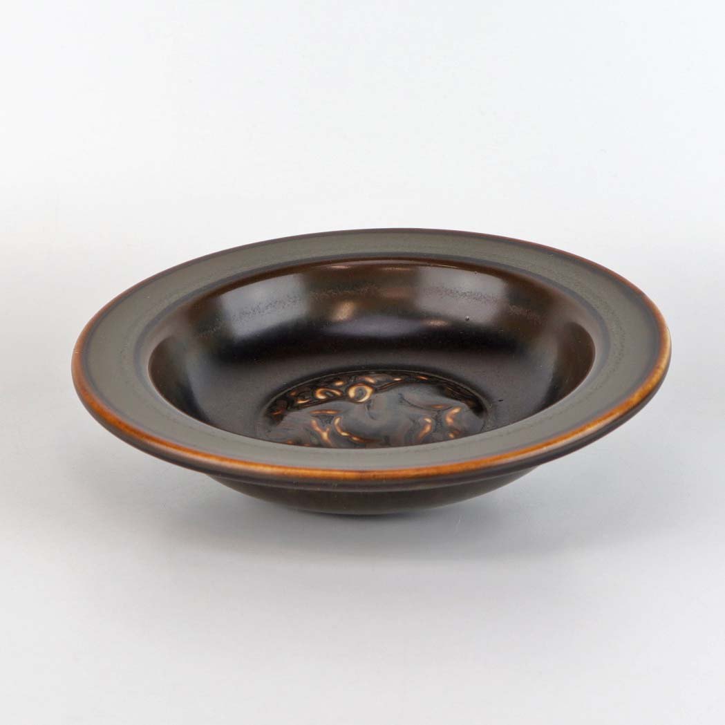 Skål i brunt stentøj med motiv af liggende hjort. Nr. 158