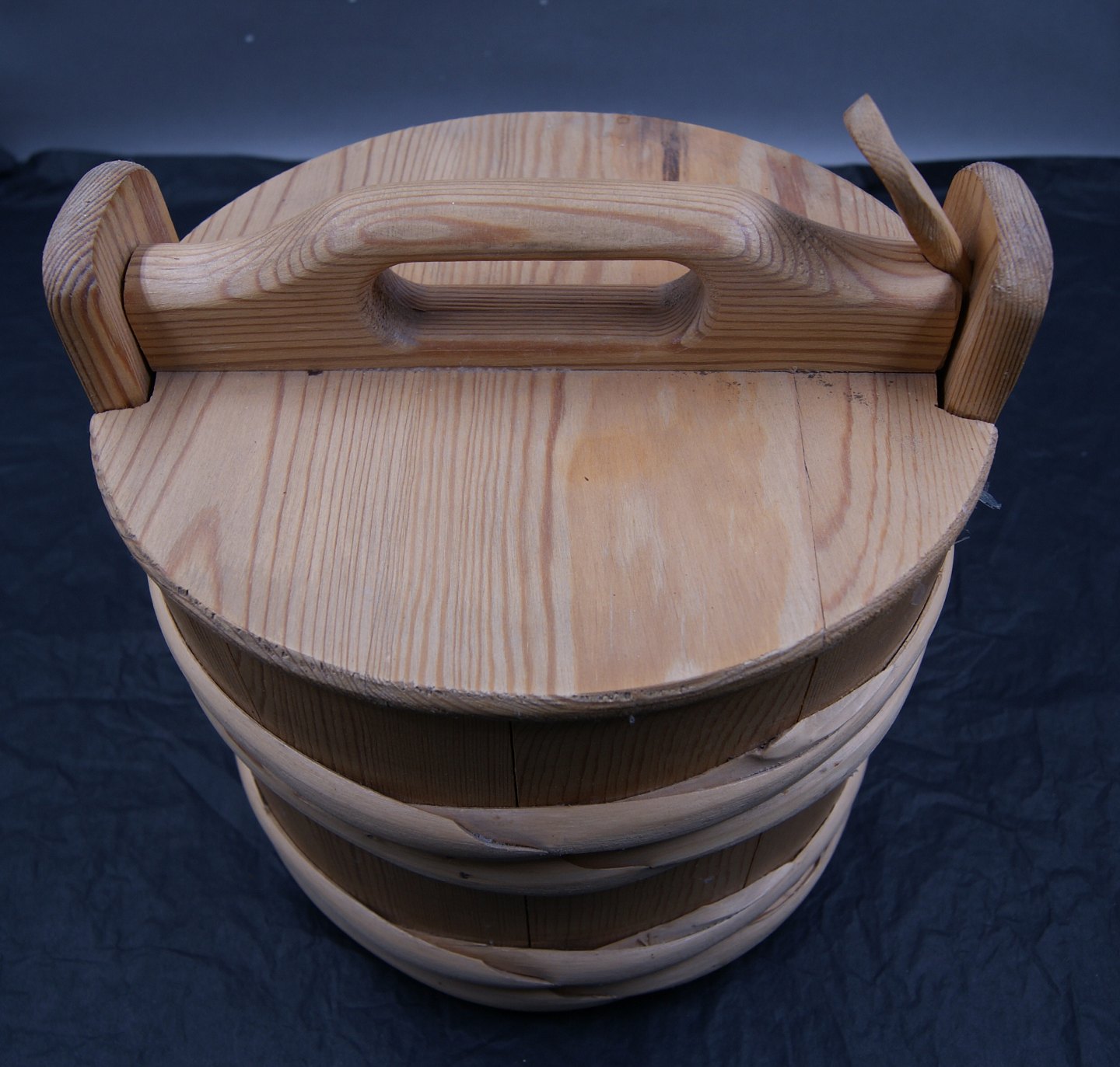 Rund tejne (madkasse) af træ, sandsynligvis fra Sverige. H 17,5cm - Ø 23cm