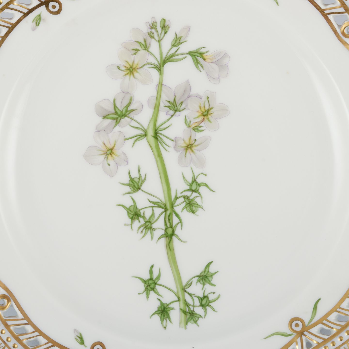 Royal Copenhagen Flora Danica gennembrudt frokosttallerken i håndmalet porcelæn med blomster og gulddekoration.