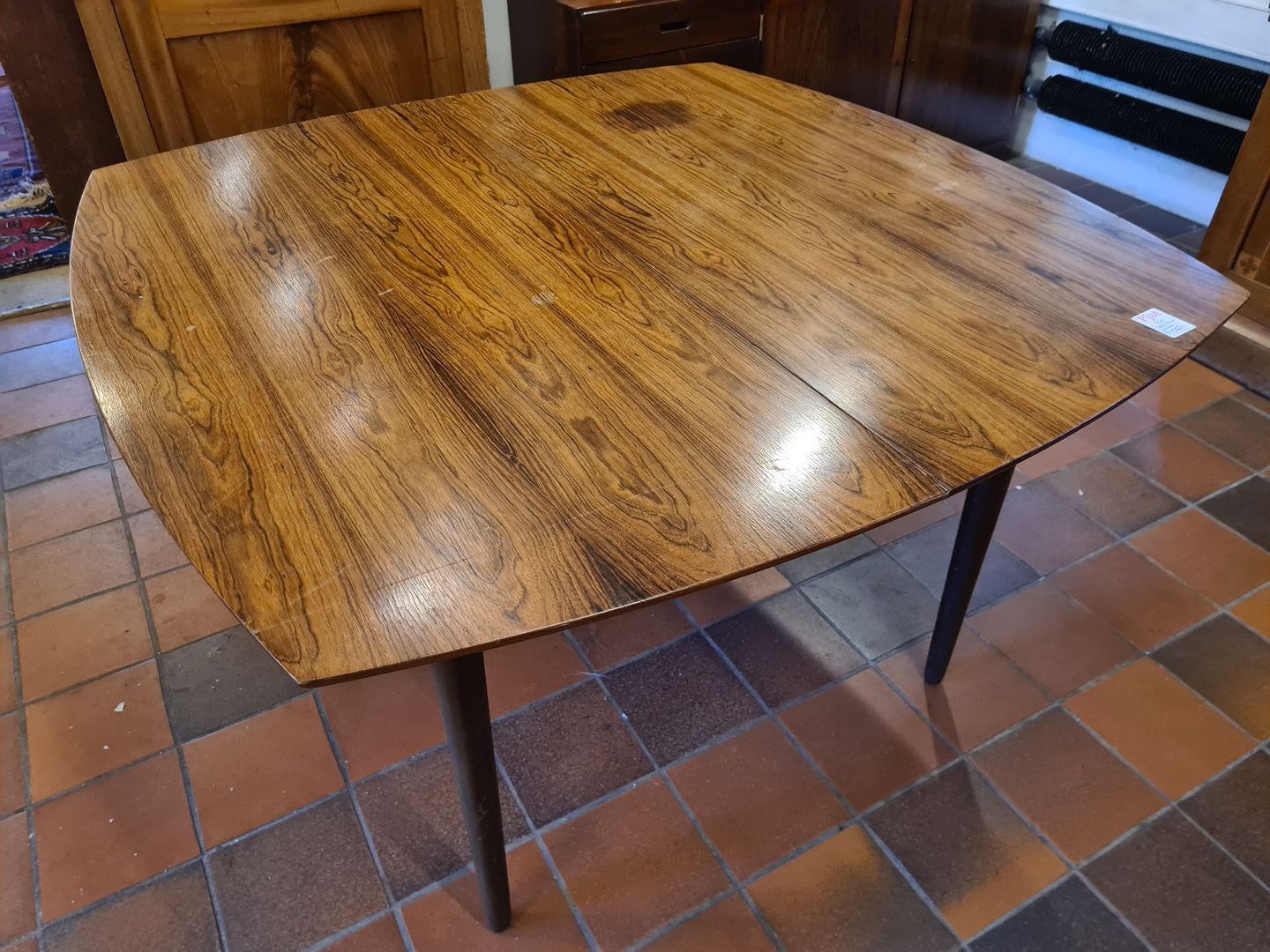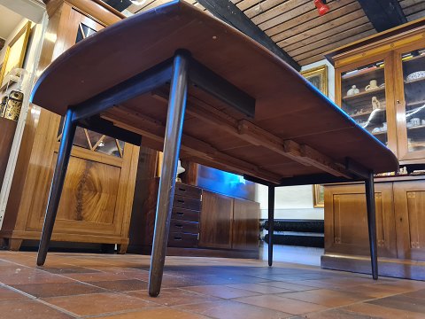 Dansk møbelproducent spisebord med udtræk. Plade i fineret palisander og stel i bejdset bøg. samt 3 tillægsplader også af fineret palisander. Fremstillet ca. 1970'erne. Fremstår med brugsspor, top lettere bleget med skjolder samt finerskader på kant af tillægsplader