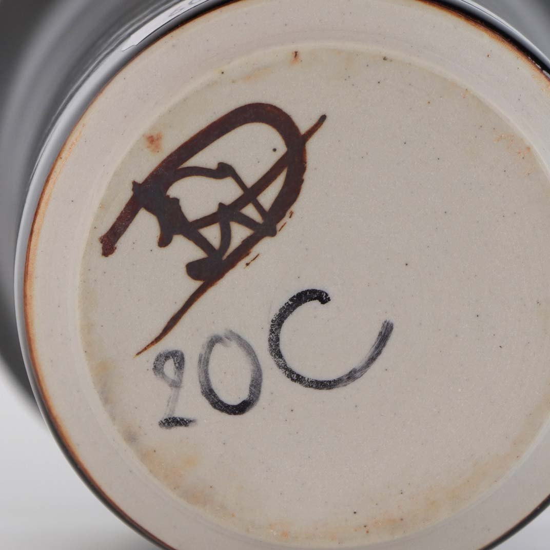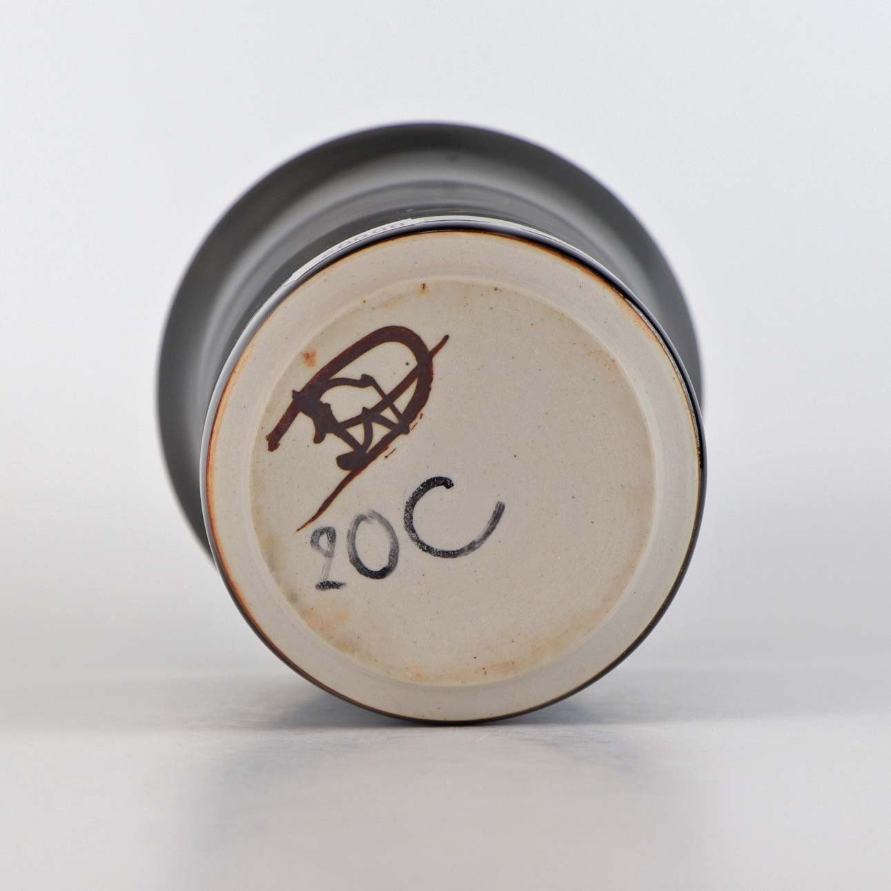 Vase i stentøj. Vasen er cylinderformet med breddere top kant og glaseret i en dyb mørkbrun farve