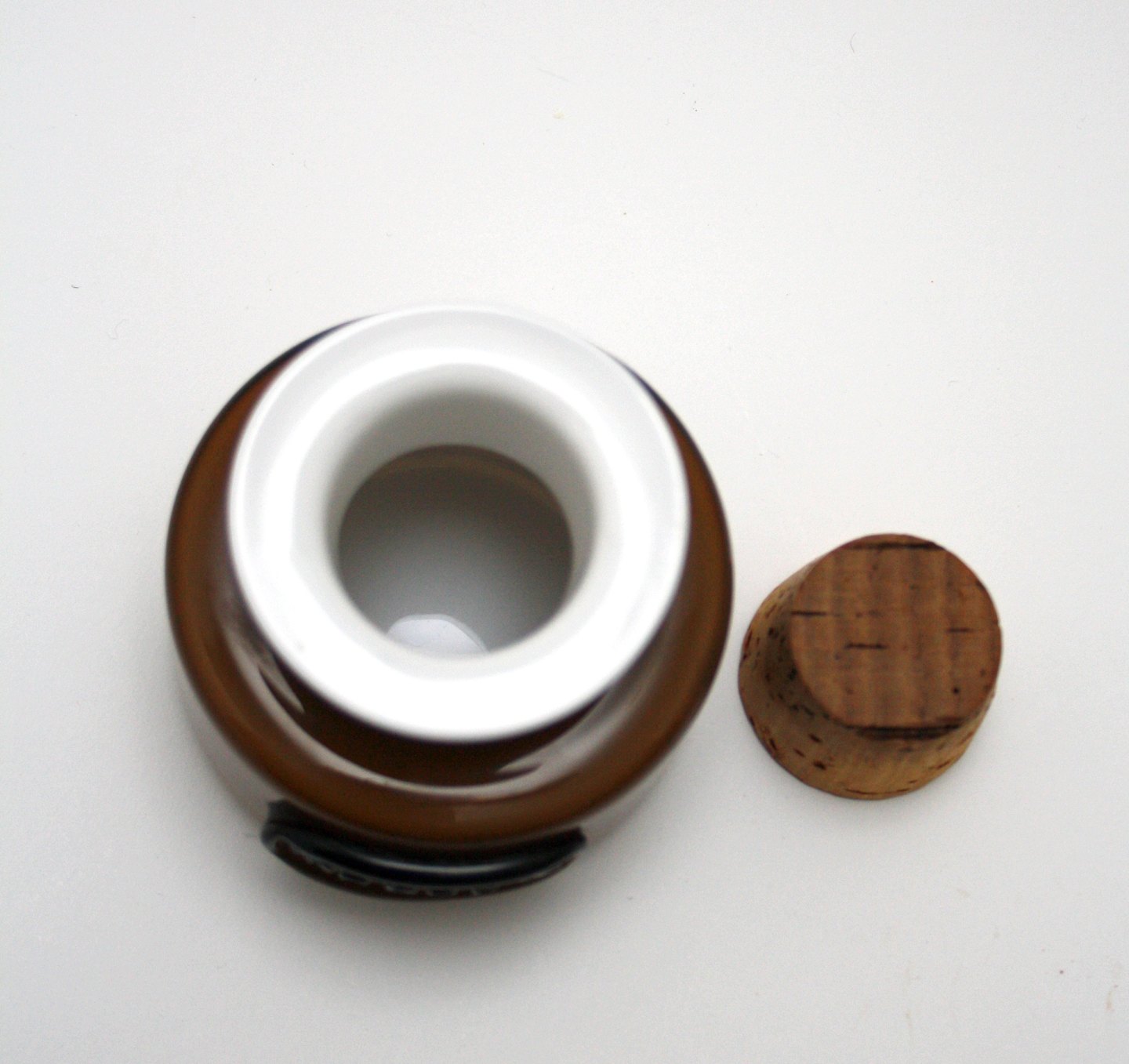 Holmegaard, Palet, Umbra køkkenserie, krydderikrukke med korkprop med krydderinavn efterfulgt af hjerte. Peber. Designet af Michael Bang i 1969, udgår i 1973. Højde med prop ca. 8,5 cm. uden prop ca. 7 cm. Diameter ca. 8 cm. Pris: 225 kr. stk. Lager: 1