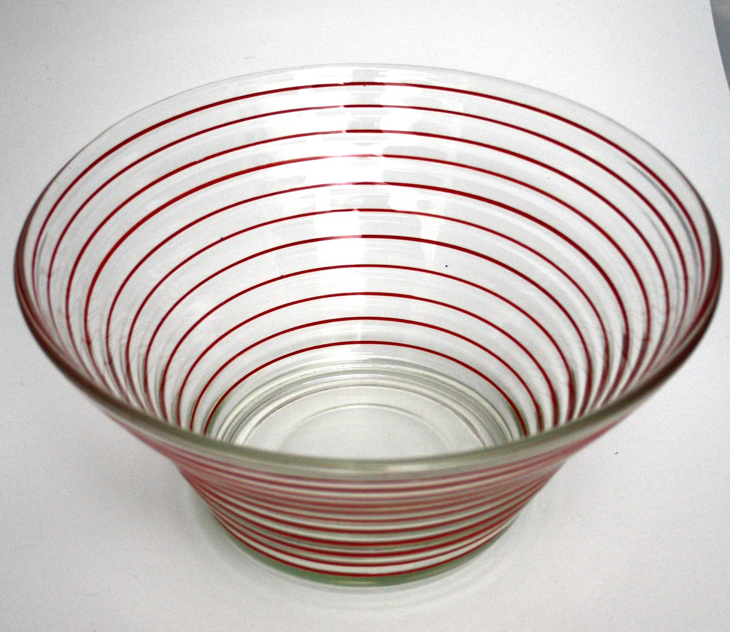 Text available in Danish: Holmegaard glasværk, Broksø fad, Stor skål, presset glas med røde striber. Designet af Jacob Bang i 1938. Højde 11,5-12 cm. Diameter 23-24 cm. Pris: 225 kr. stk. Lager: 3