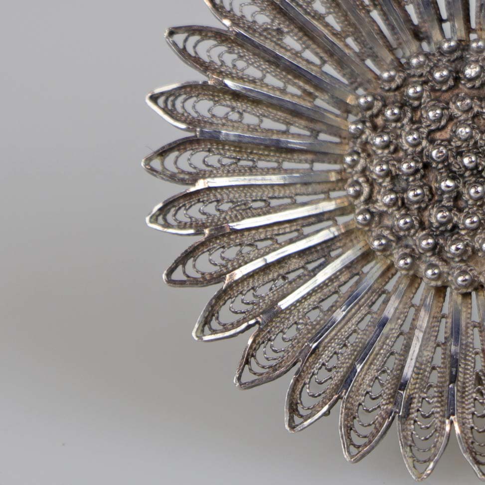 Filigran broche i sølv med motiv af marguerit blomst