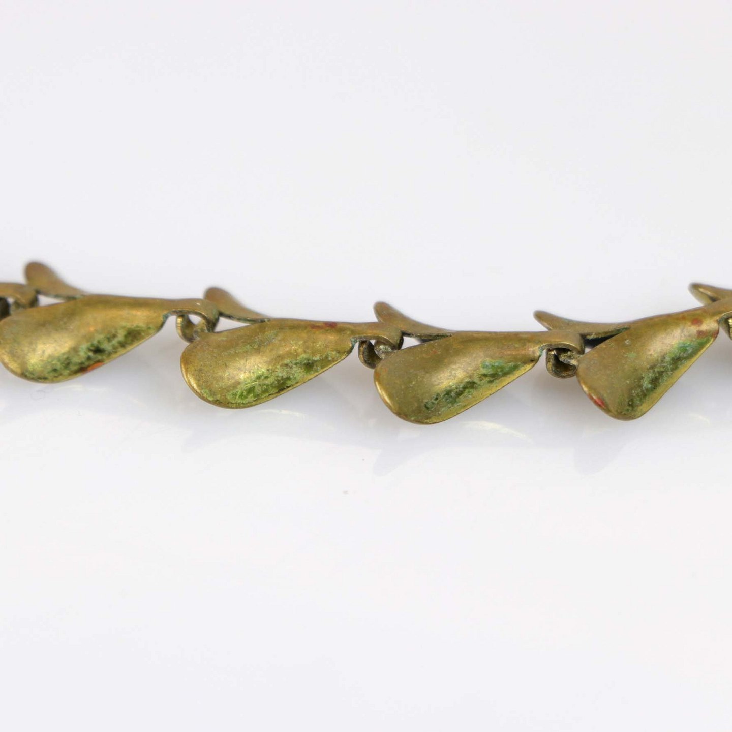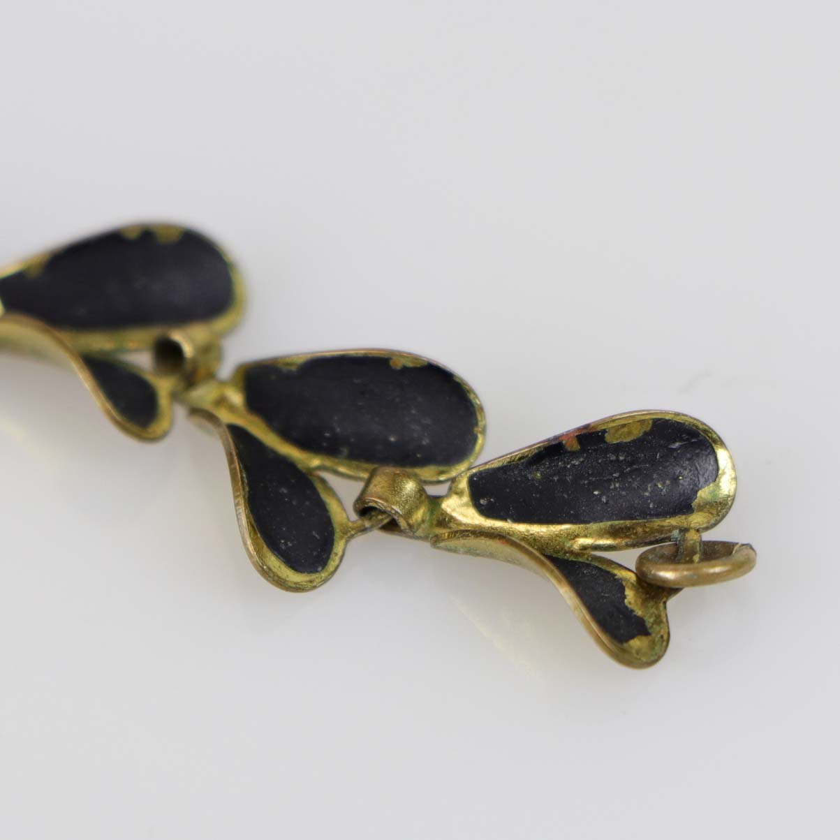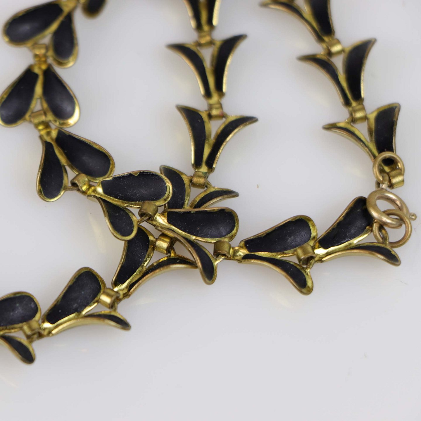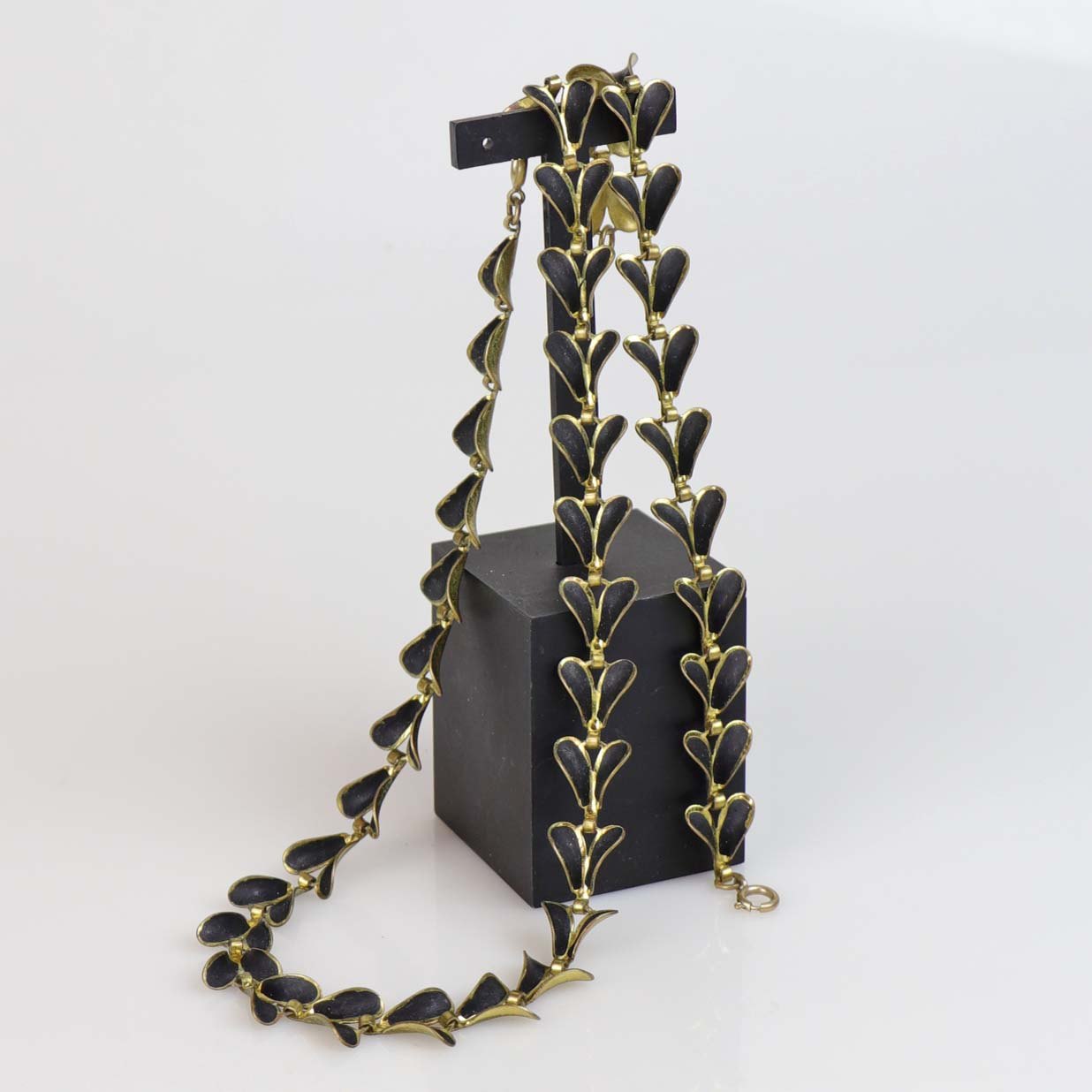 Et sæt med halskæde og armlænke i guldbelagt messing belagt med sort emalje og motiv af dobbbelte blade
