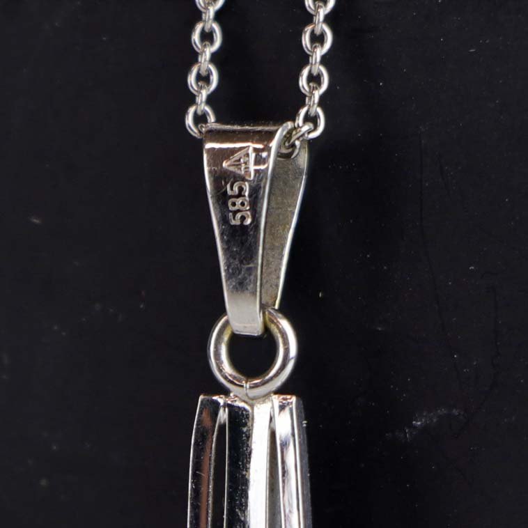 Halskæde og vedhæng i 14 karat hvidguld. Det aflange vedhæng er med montreret lys perle og to mindre klare sten