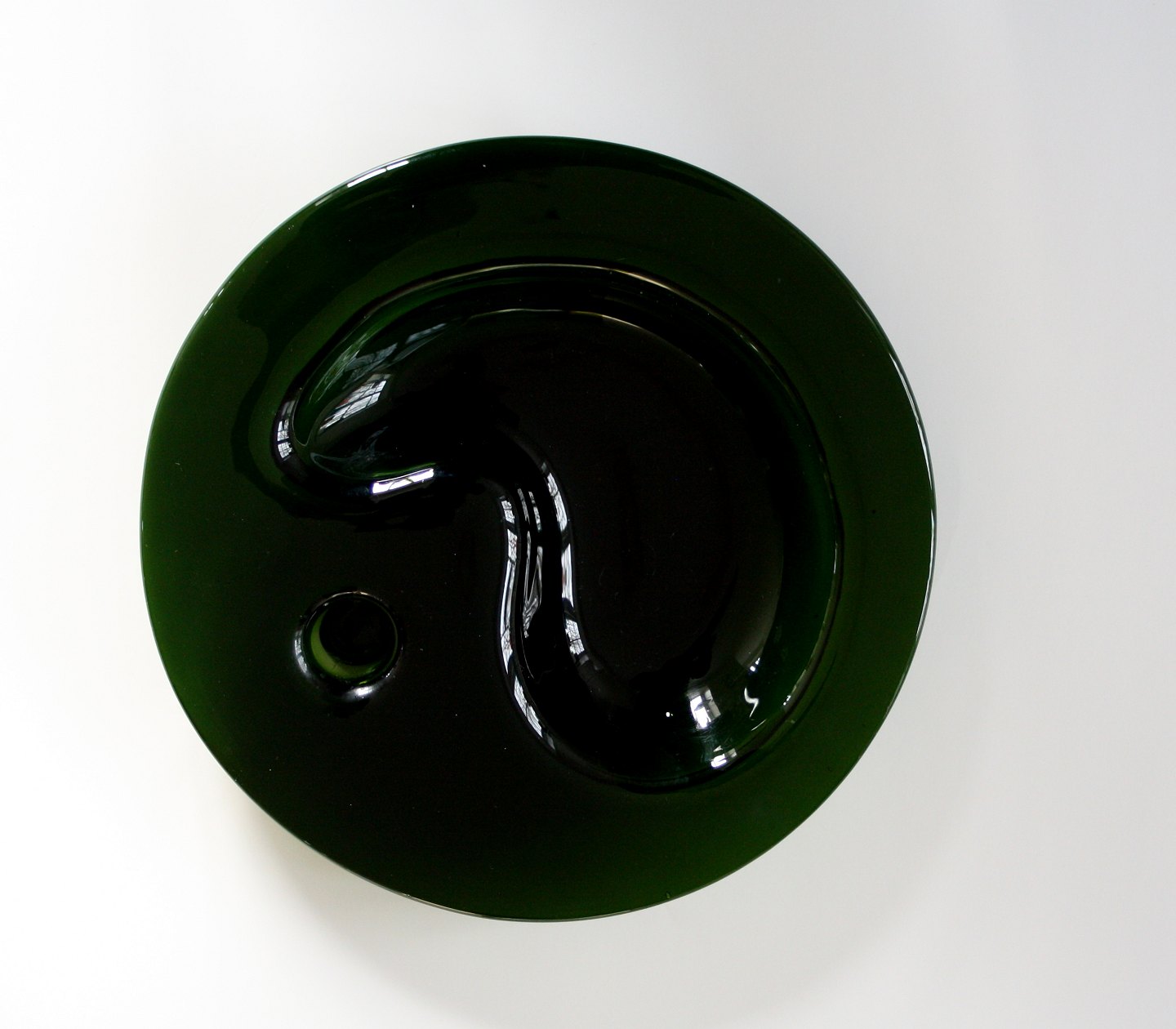 Fyens Glasværk/Holmegaard, Ikebana jadegrøn blomsterfade, mundblæst i form. Designet af Michel Bang i 1975.
