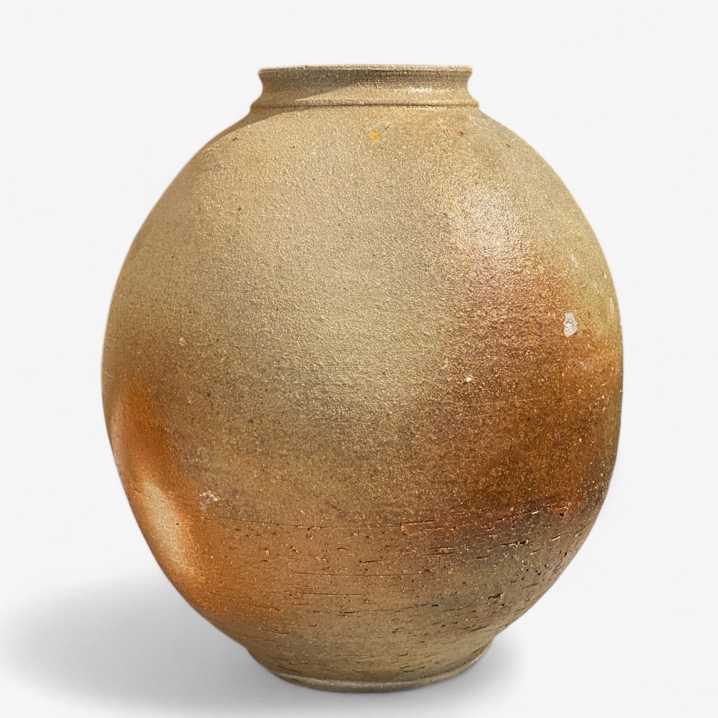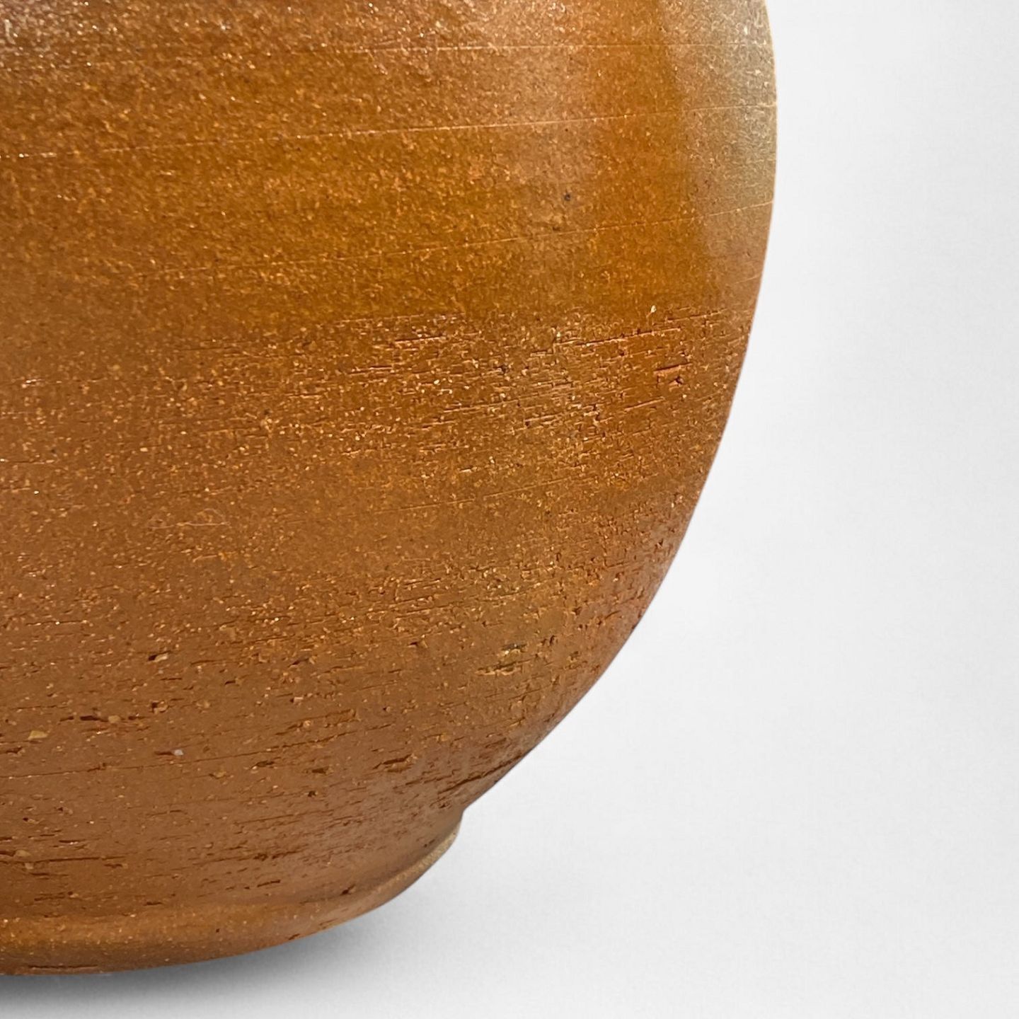 Rund vase i stentøj i brune og orange nuancer.