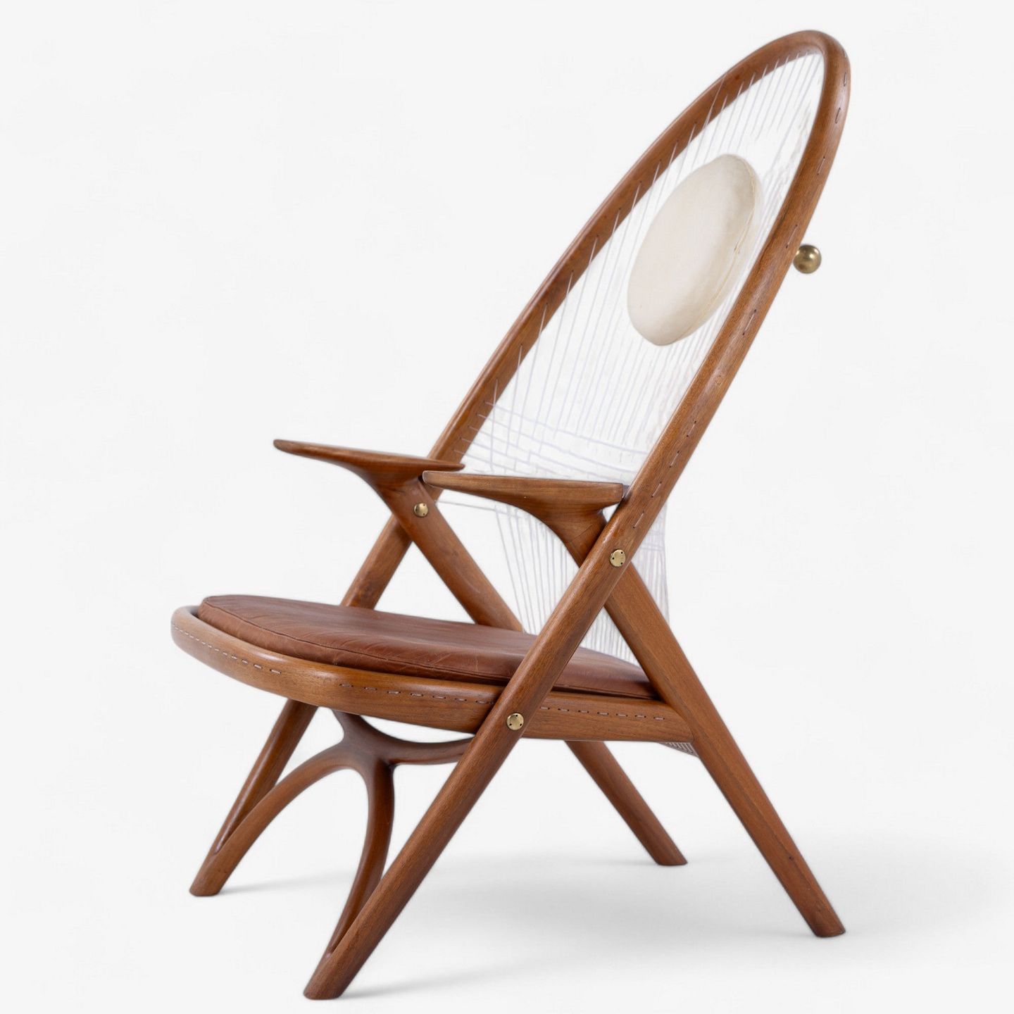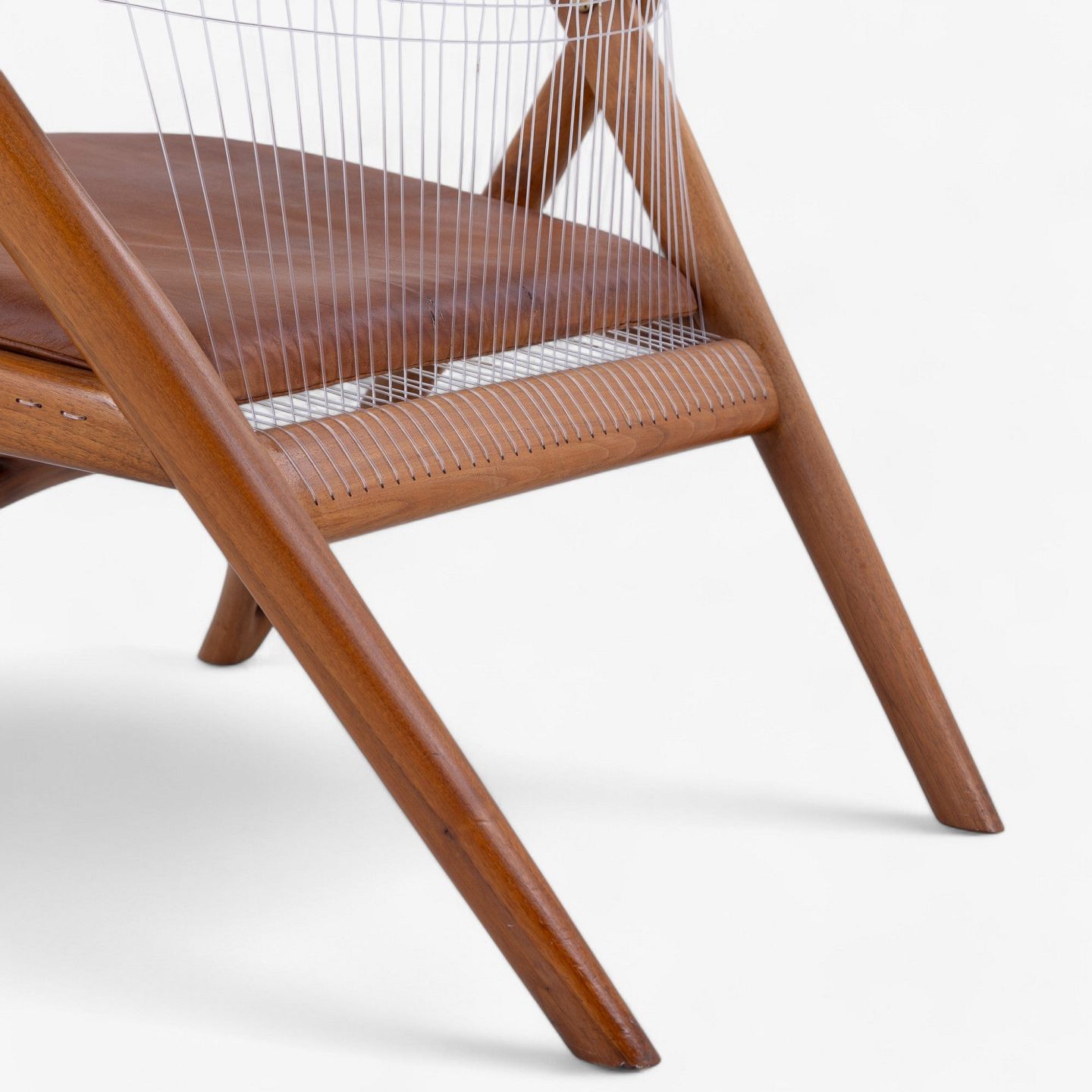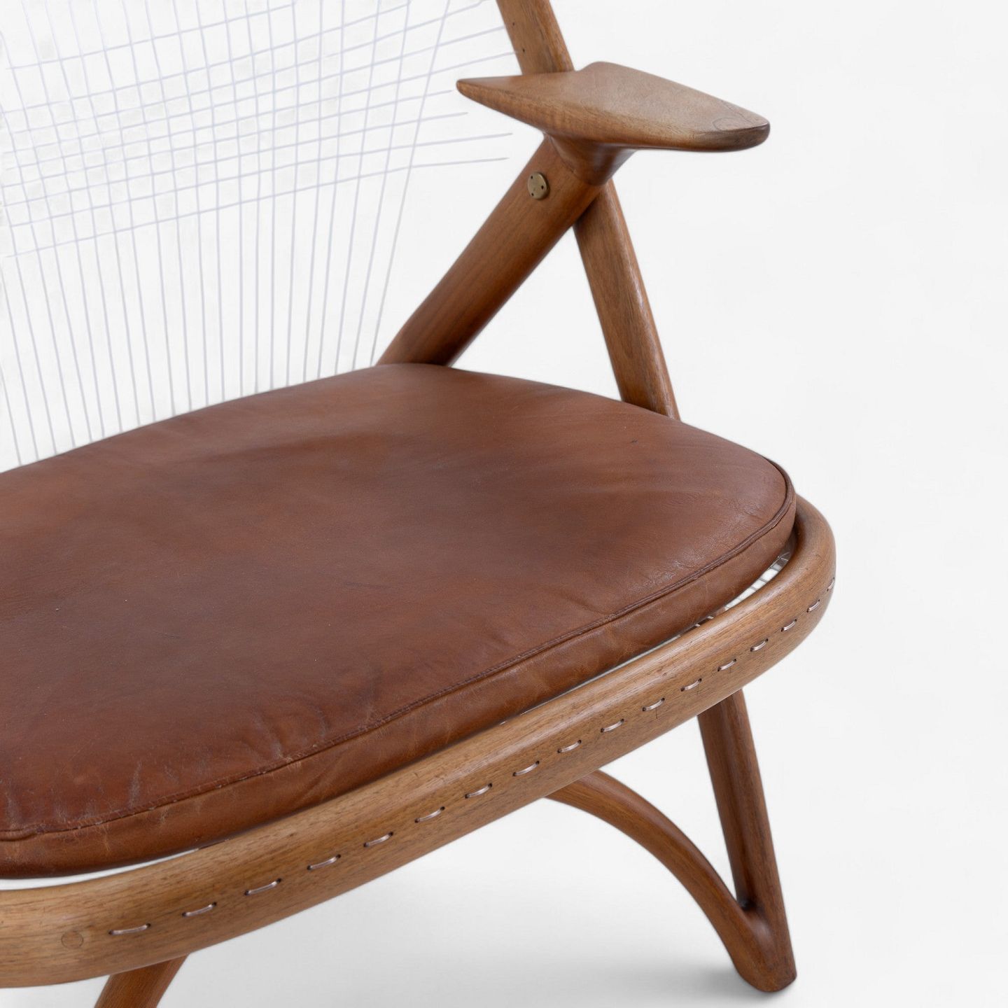 Sjælden lænestol i nøddetræ, nylon, originalt lædersæde og patineret pergament nakkehynde. Formgivet i 1955.