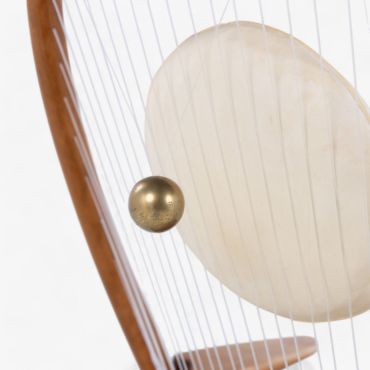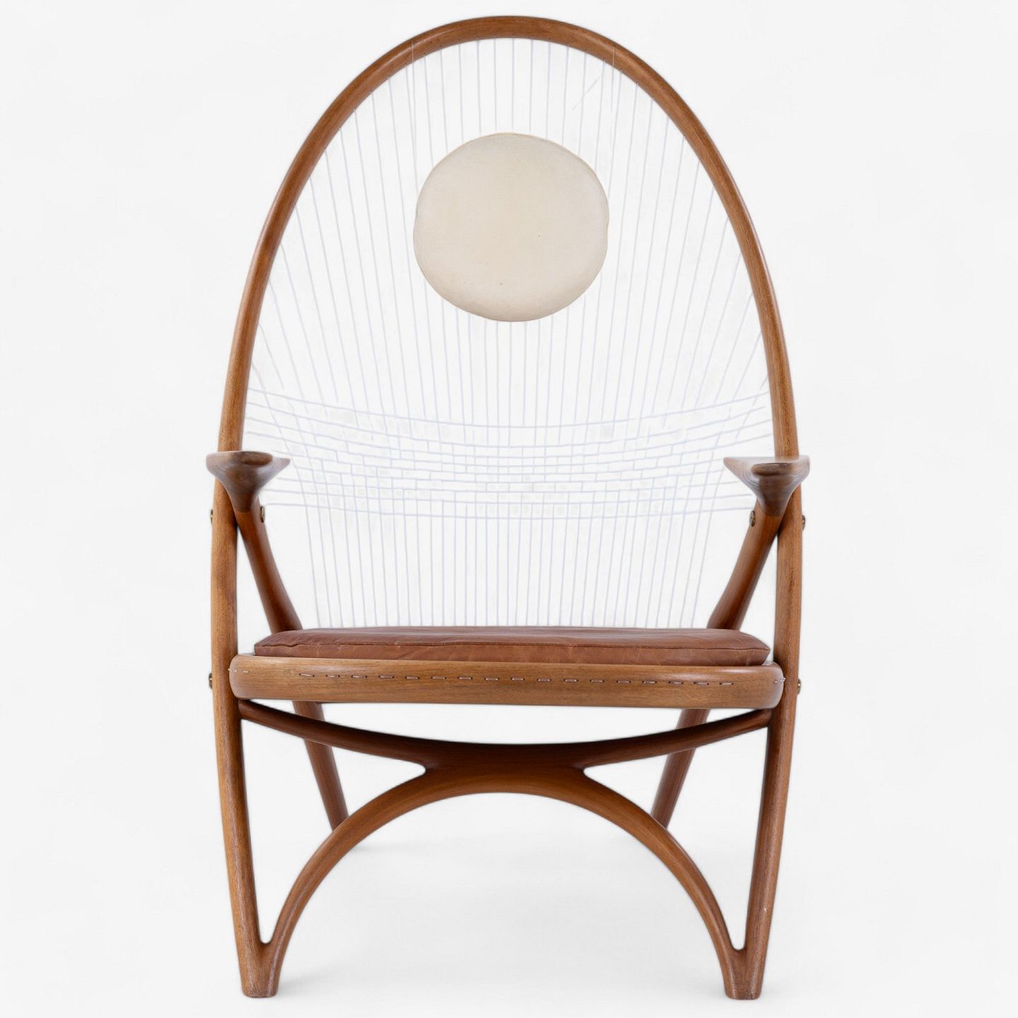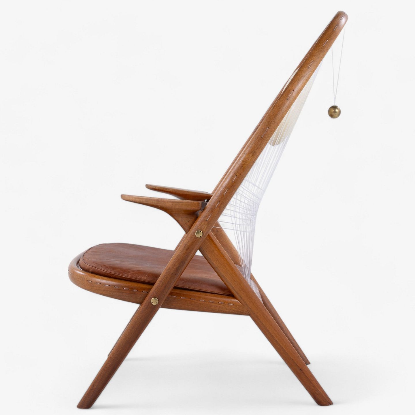 Sjælden lænestol i nøddetræ, nylon, originalt lædersæde og patineret pergament nakkehynde. Formgivet i 1955.